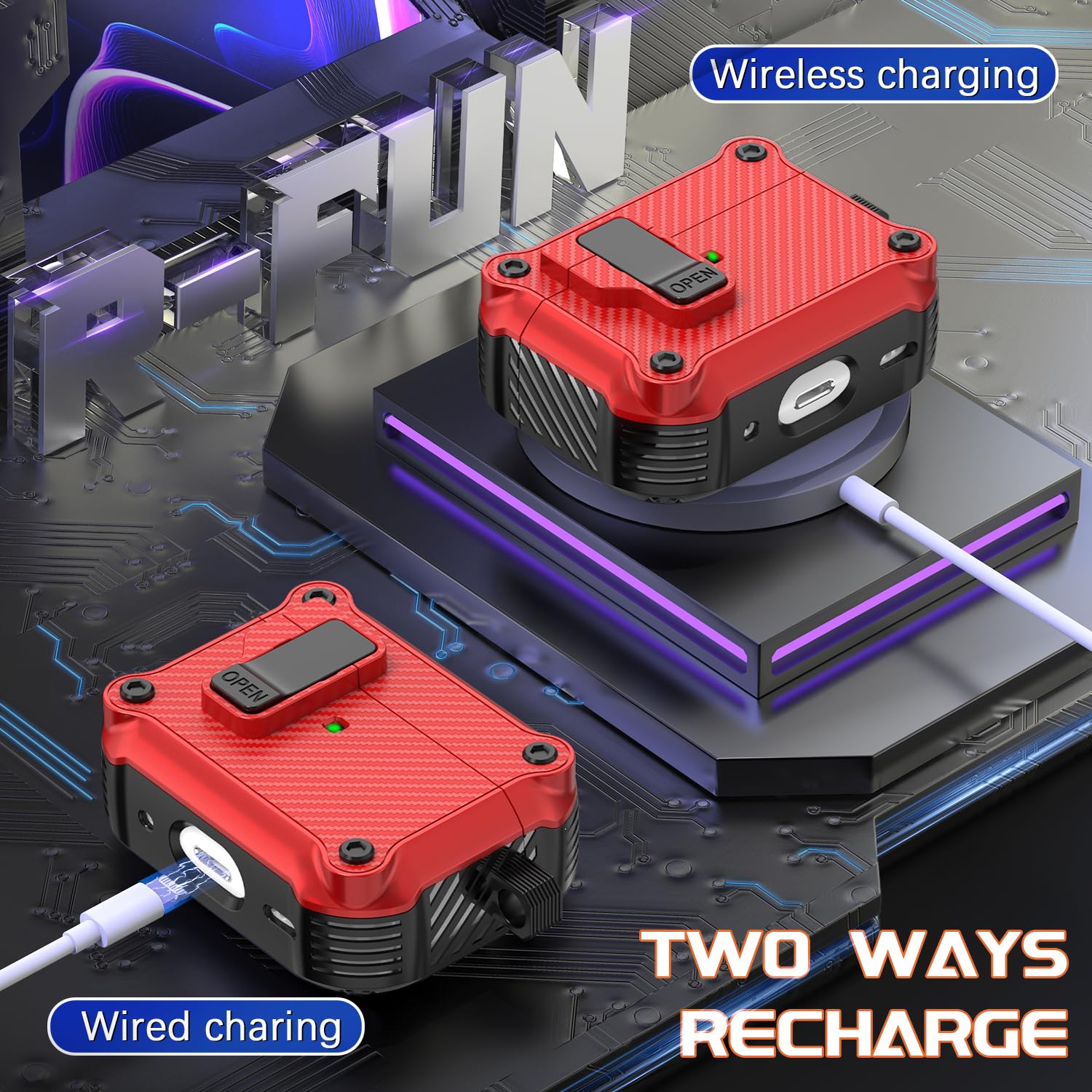 R-fun Airpods Pro (第 2/第 1 世代、2023/2022/2019) ケース、自動安全ロック付き、Airpods Pro 2 と互換性あり (USB-C/ライトニングケーブル)、カーボンファイバーキーチェーン付きハードシェル保護カバー-レッド