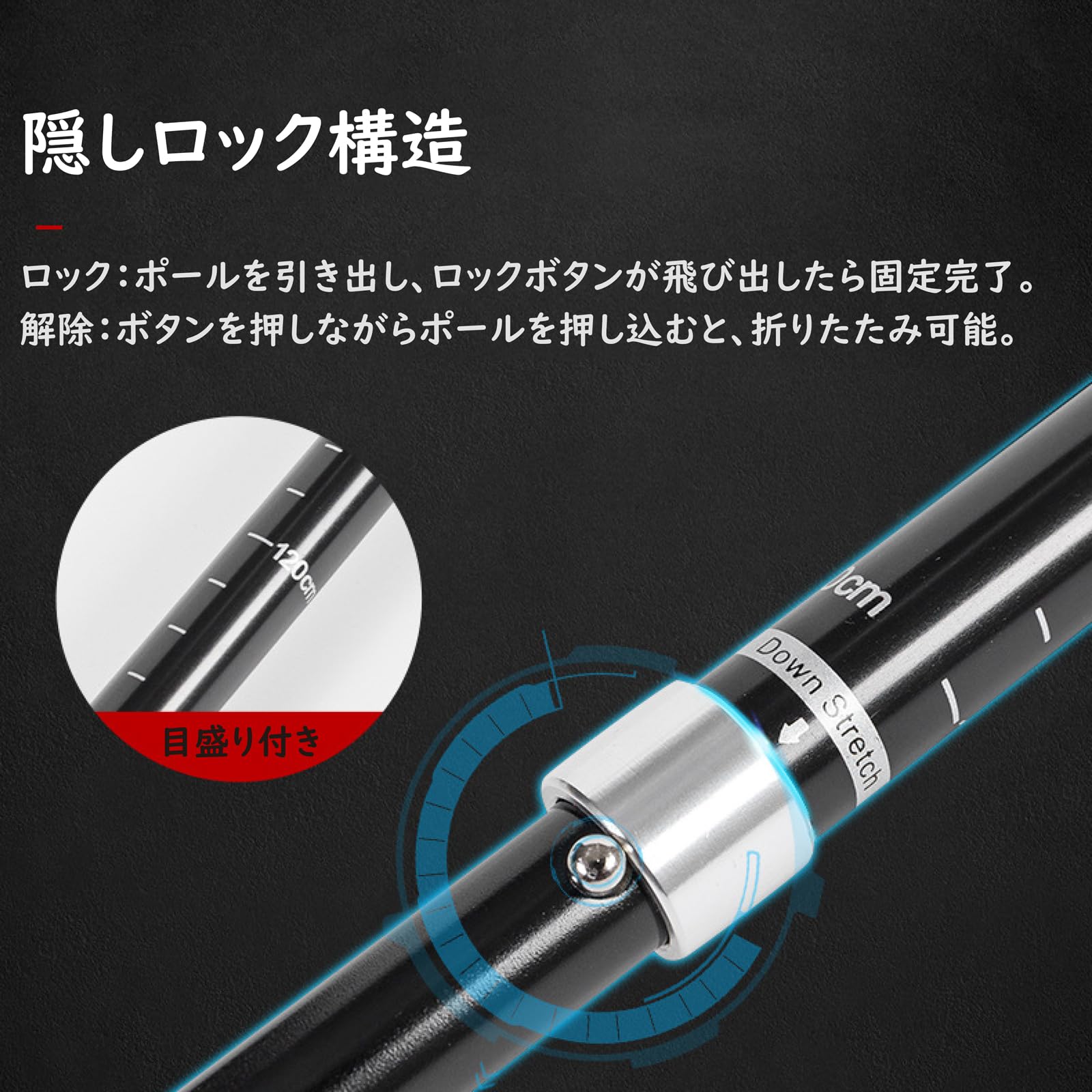?【高さ調節&目盛り付き】使用サイズは95-110cm/110-130cm、身長目安145〜170cm/170〜190cm。トレッキングポールには目盛りがあり、長さ調整が一目で分かります。隠しロック構造により、ロックボタンが飛び出せば固定完了、解除もワンタッチで簡単です