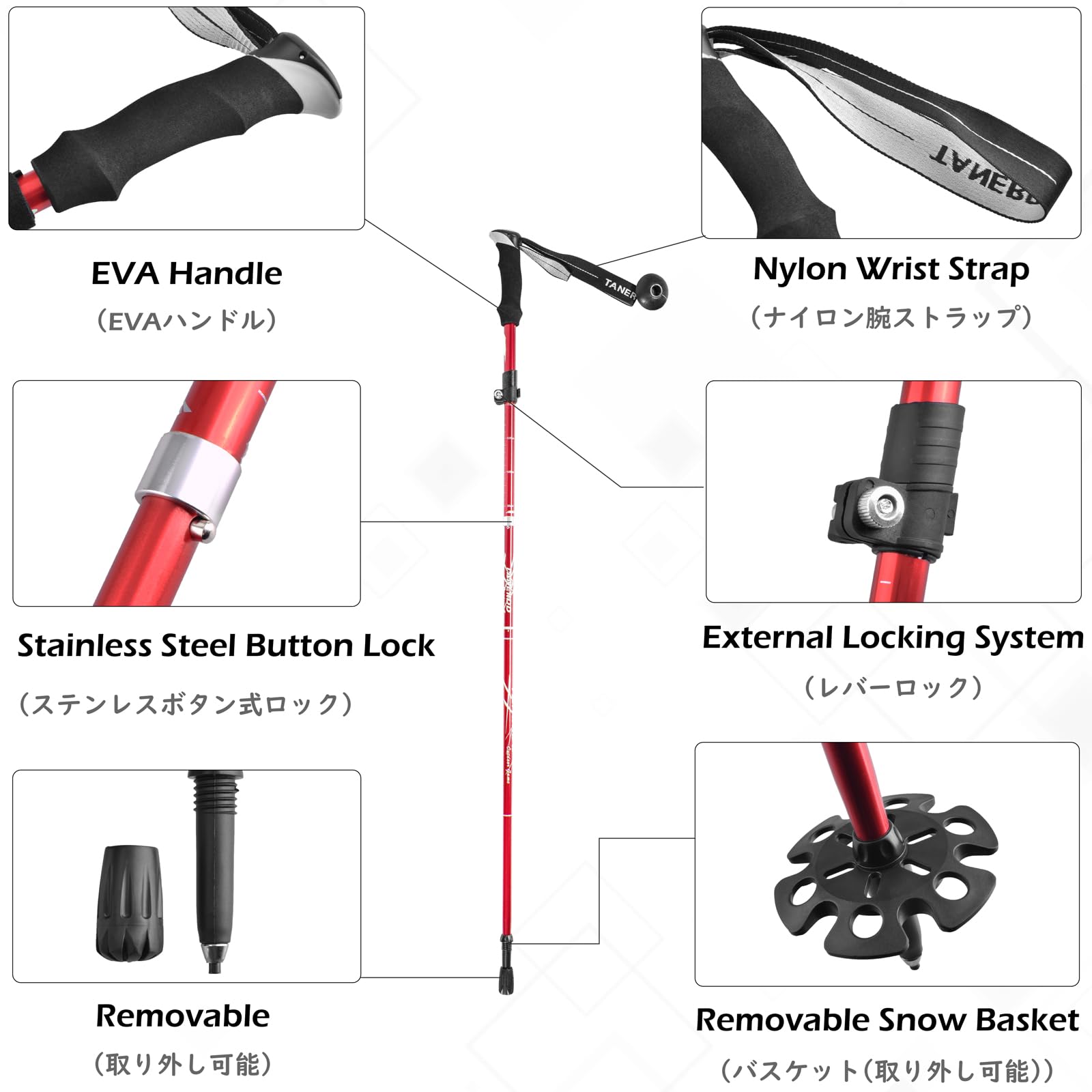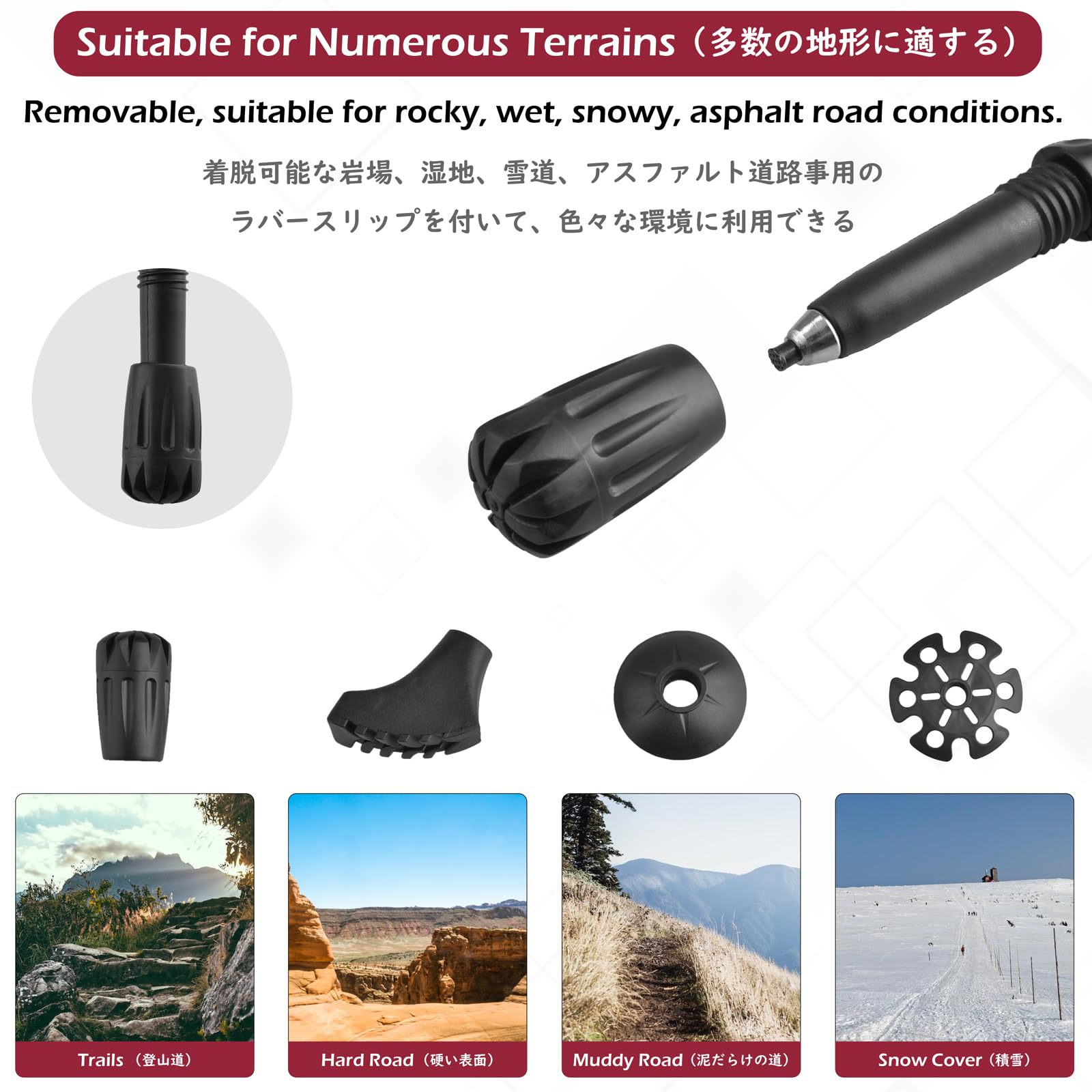 ?【充実の付属品&多用途対応】先端カバー、バスケット、収納袋が付属し、登山、ハイキング、トレッキング、ウォーキング、雪道など様々な地形に対応可能。一本から購入できるので、用途や好みに合わせて自由に組み合わせ可能です