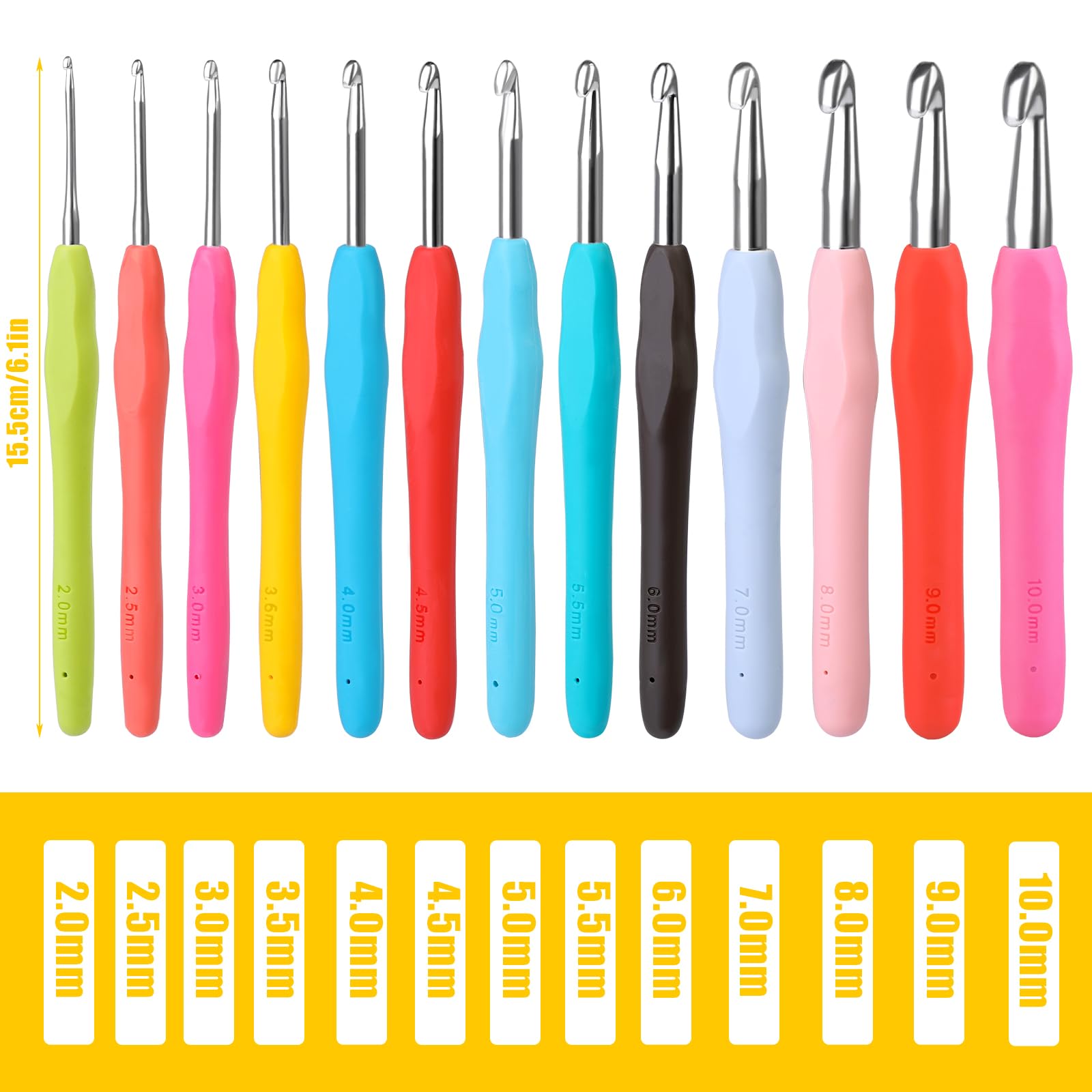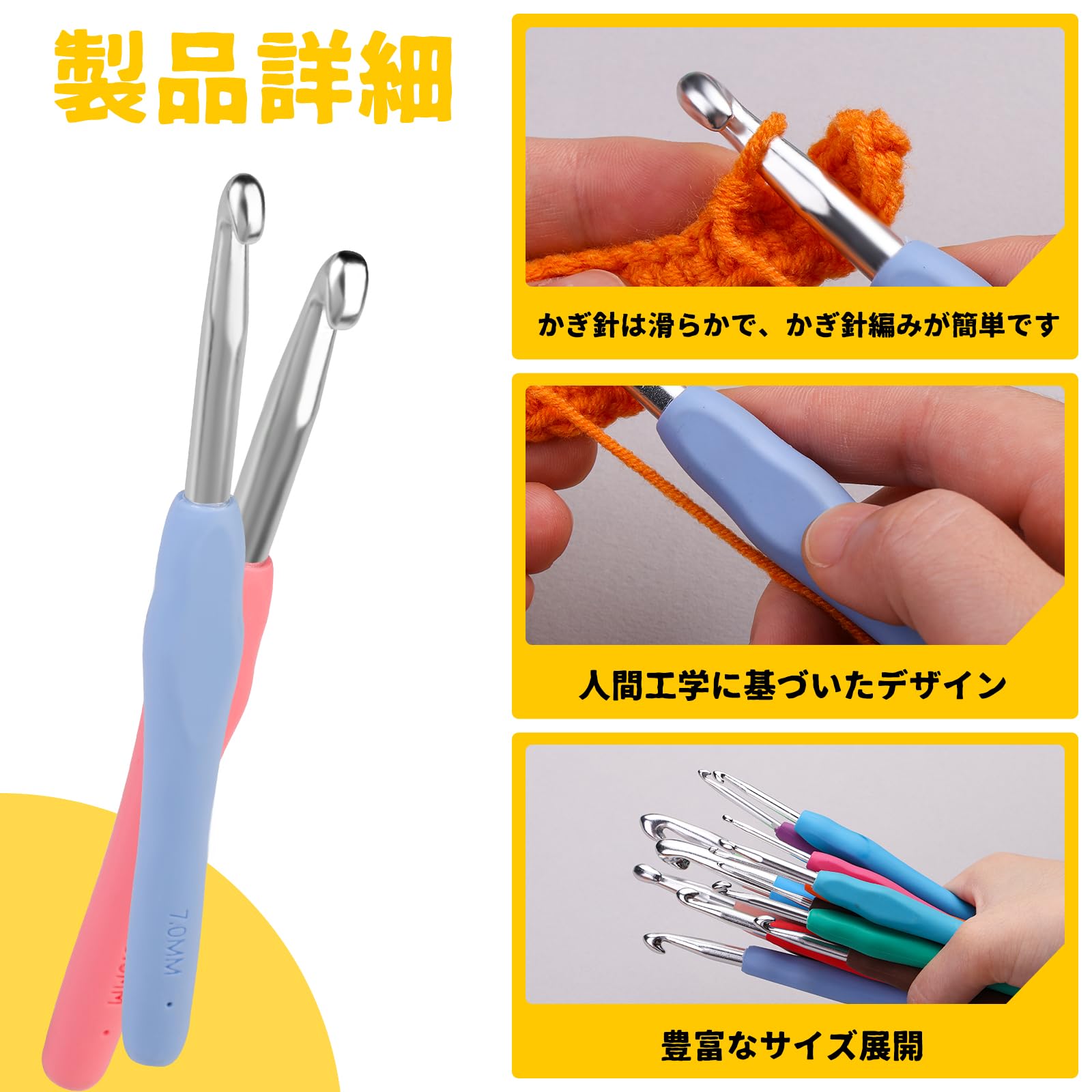 かぎ針セット内容: 13*編み針、10*段数マーカー、1*ハサミ、1*目数段数計、9*縫い針、2*なわあみ針、1*PUバッグ、1*カッター。編んだ時に余計な引っ掛かりがなく、初心者でもスムーズに編むことのできます。
