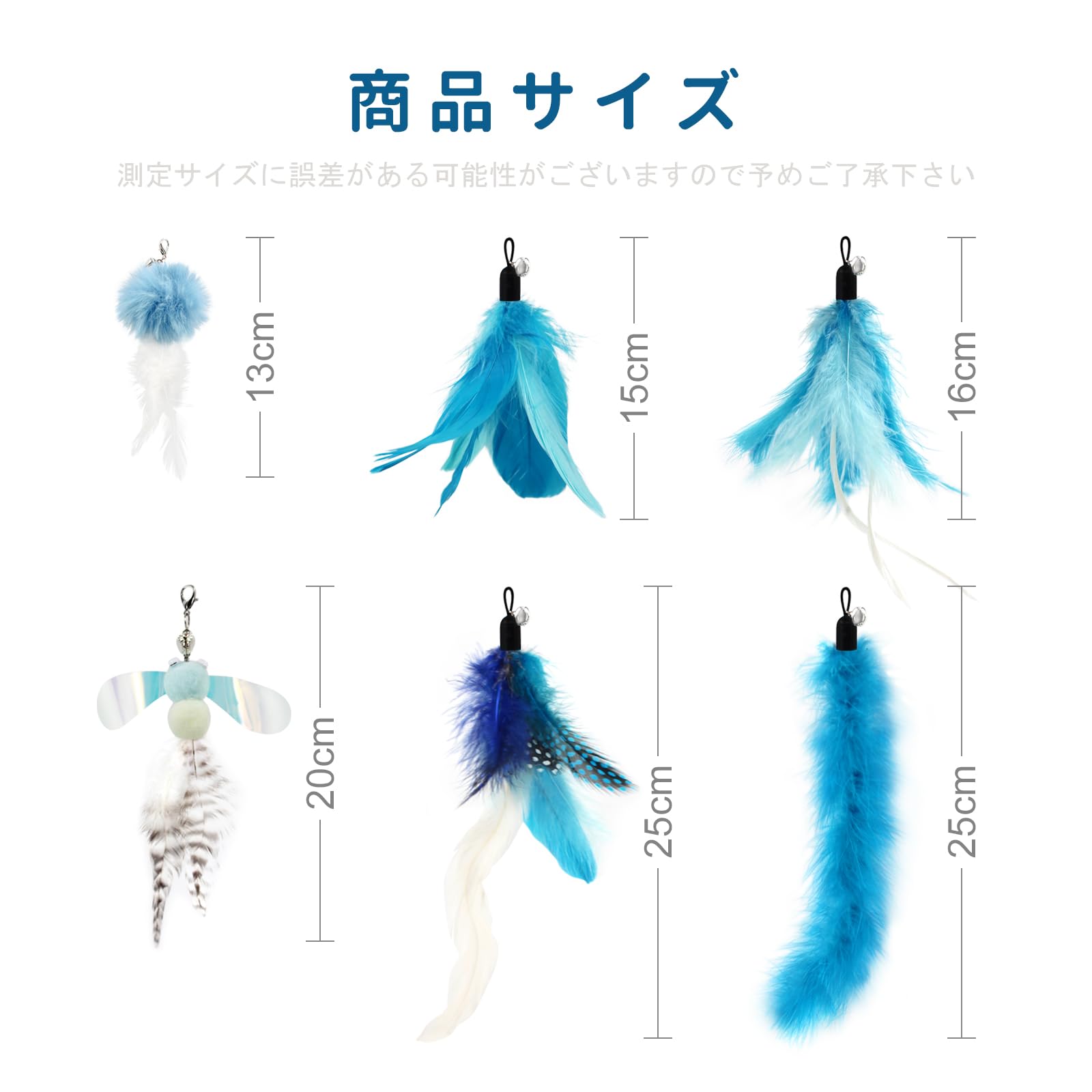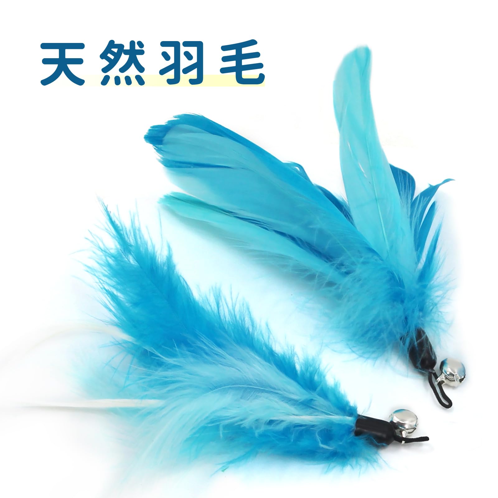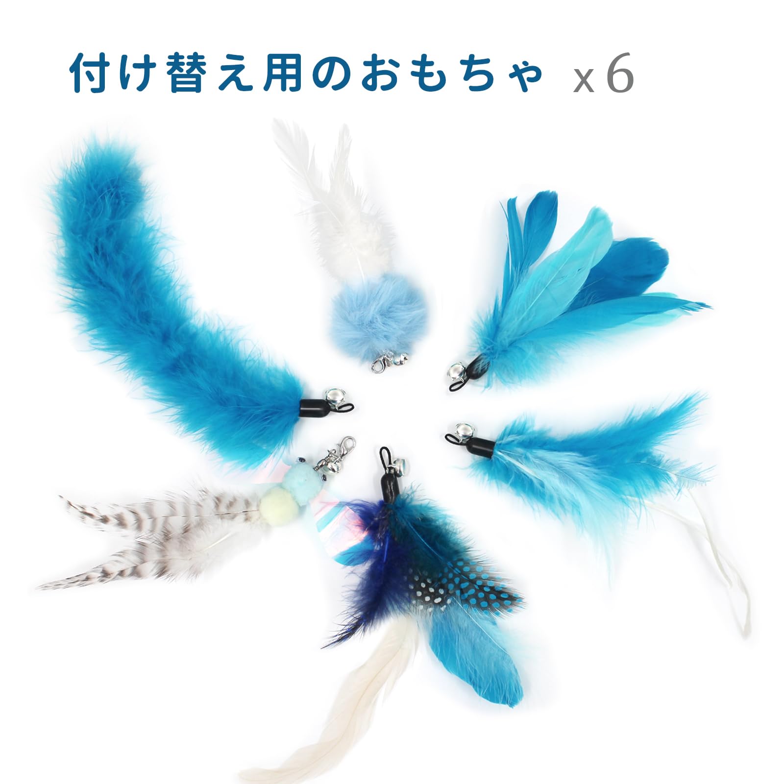 安全安心に遊べる天然鳥の羽根(6羽):ねこじゃらしの先端につけるおもちゃは6ブルー系羽根、楽に交換できる羽単品のおもちゃ(羽のおもちゃ6セット)釣り竿なし
