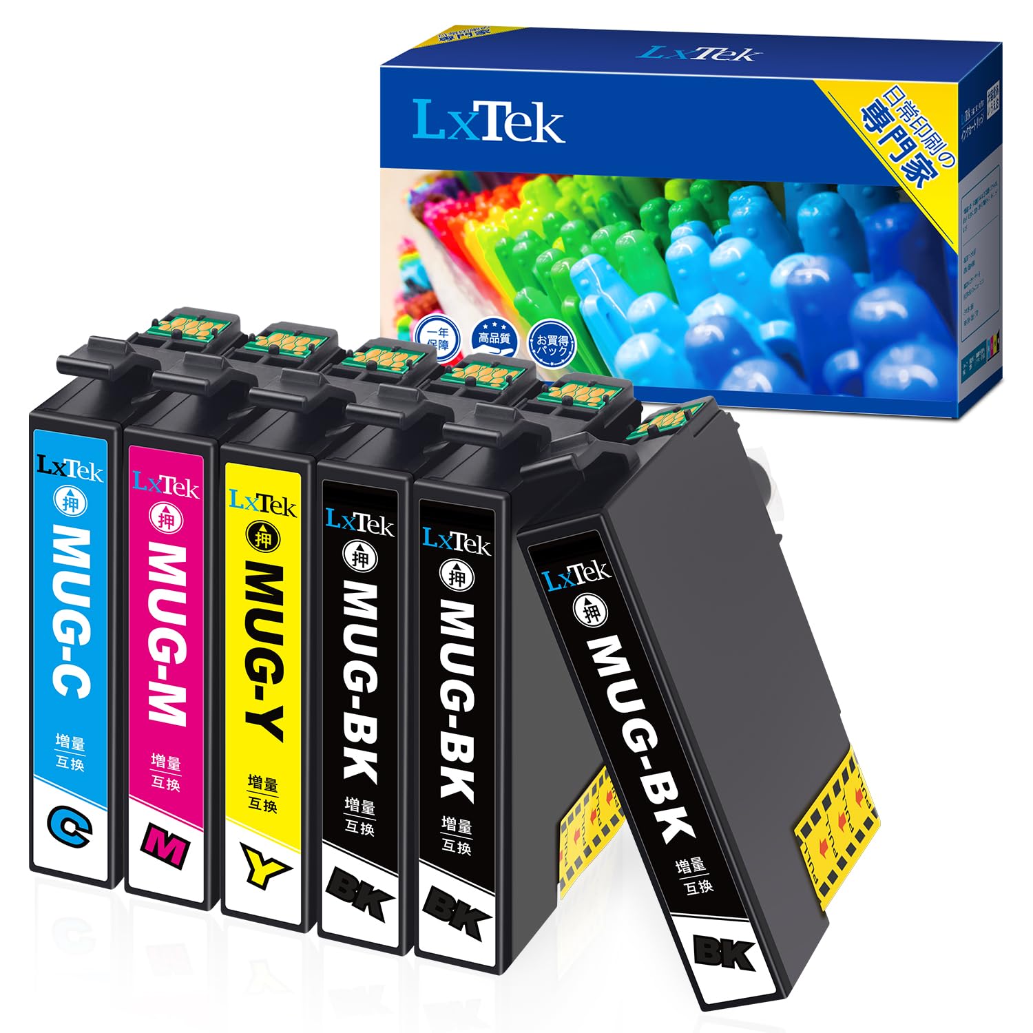 【パッケージ内容】LxTek Epson用 MUG-4CL 互換インクカートリッジ増量4色セット(ブラック/マゼンタ/シアン/イエロー)+黒2本 合計6本、取り扱い説明書。