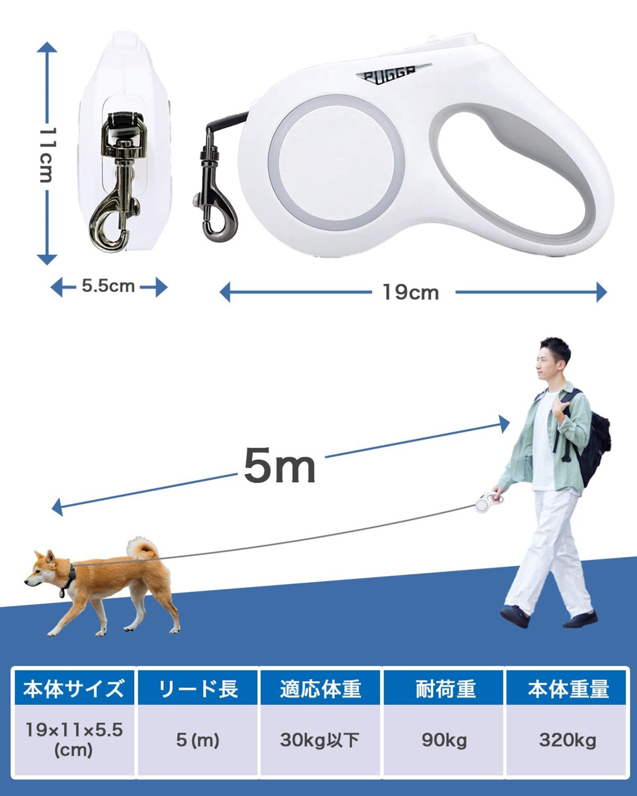 【数量限】犬 リード 伸縮 ロングリード LED ライト付き 光る 長さ5m 自動巻き ストラップ付き リフレクター 光反射 夜散歩 小・中型犬用 [長さ:5m 適応体重30kg]