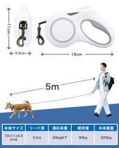 犬 リード 伸縮 ロングリード LED ライト付き 光る 長さ5m 自動巻き ストラップ付き リフレクター 光反射 夜散歩 小・中型犬用 [長さ:5m 適応体重30kg]