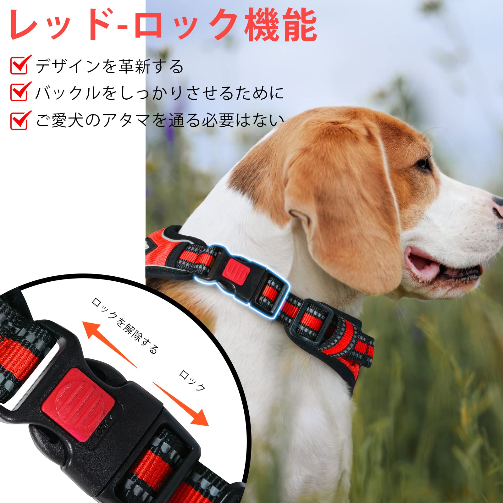 【引っ張り防止&ロック機能バックル】:胸元の金属のDリングっかにリードを通しただけで、犬が引っ張ると、あなたの方を向いて向きを変えるので、すぐに引っ張りをしなくなります。引っ張り癖が弱くなることができます。首のバックルはロック機能があります(赤い部分)。ロック状態で抜けないで、ご愛犬を保護のため、「アンロック」に簡単に抜けます。しっかりとした作りでワンコが守られてます!