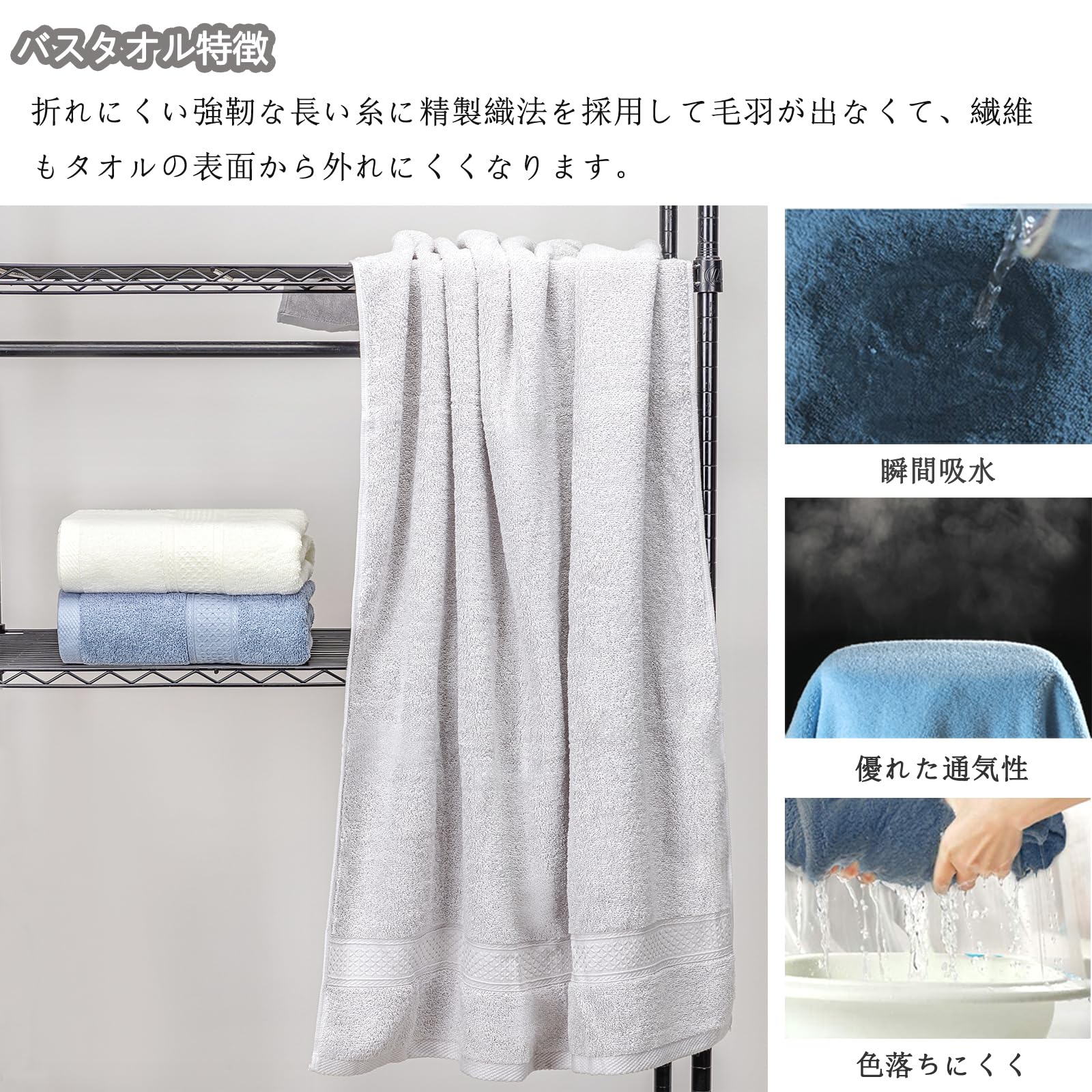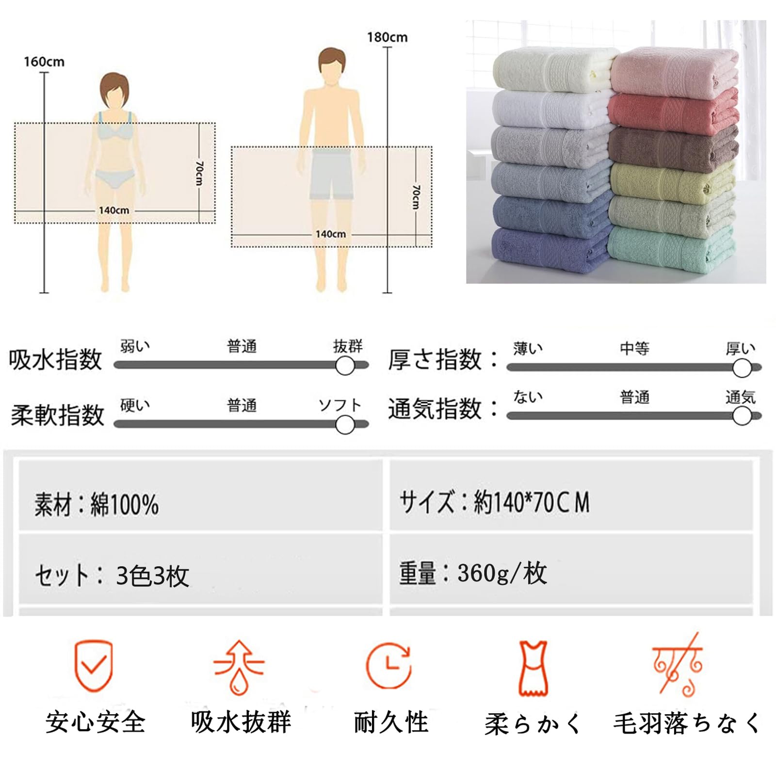 バスタオル 3枚セット 綿100% 大判 ホテル仕様 タオル 吸水力 肌触り良くふわふわ 耐久性 抗菌防臭 吸水速乾 70×140cm 重さ約360g/枚 四季通用 家庭、ホテル、スポーツなどに最適