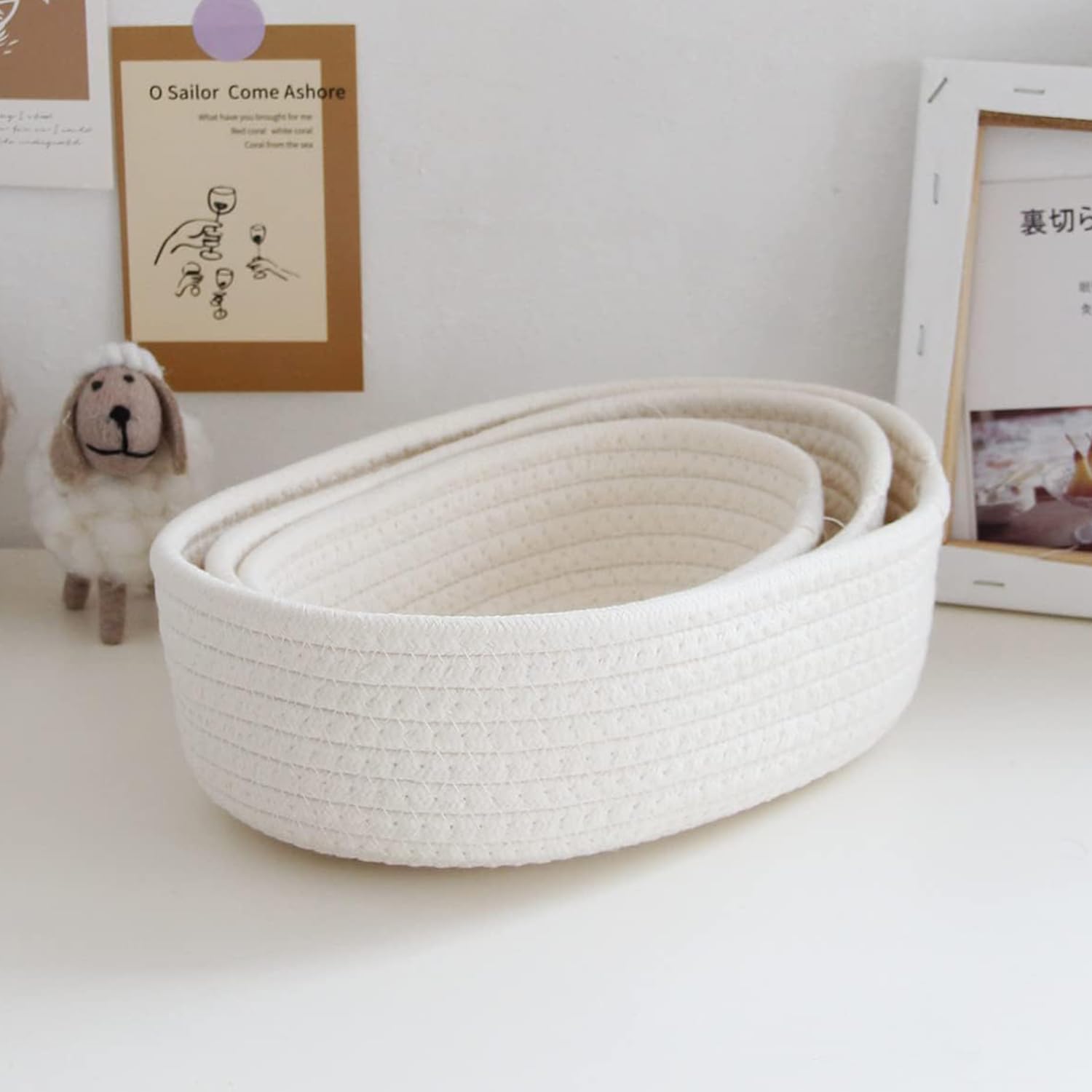 収納バスケット 3点セット コットンロープ 積み重ね 編み込み バスケット 織り 収納ボックス 小物 おもちゃ かご 省スペース (オフホワイト)