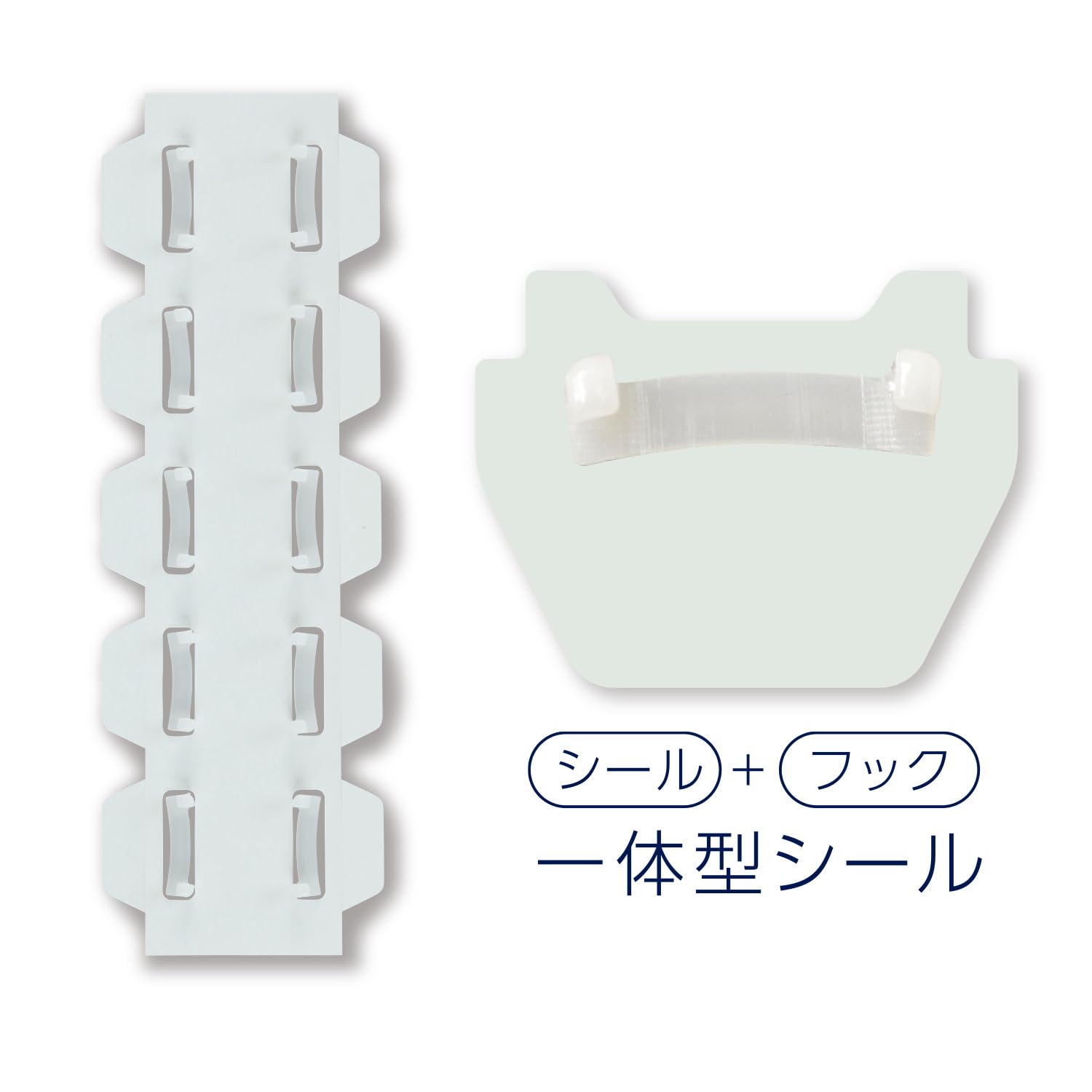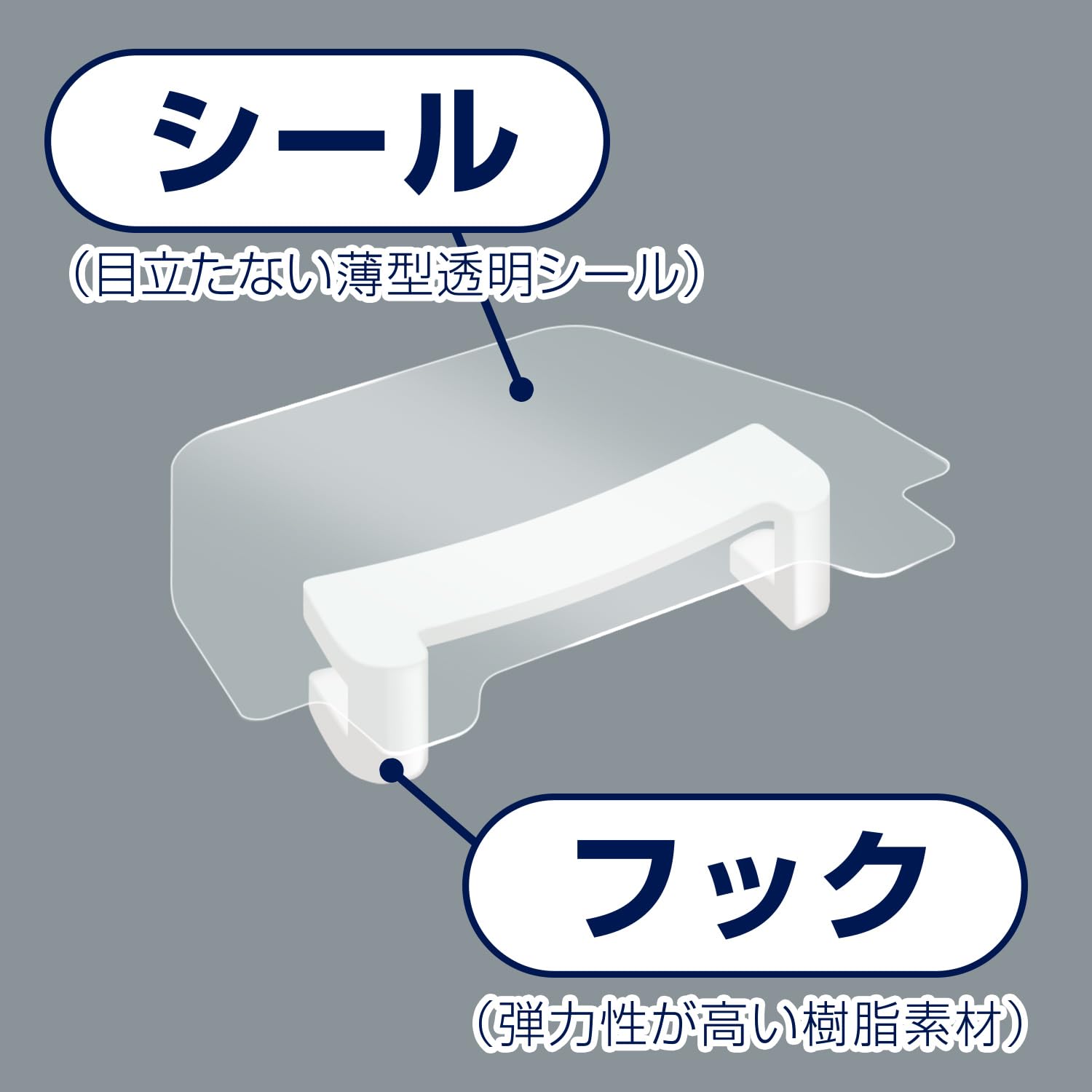 【フックと一体型シール】目立たない薄型透明テープに弾力性の高い樹脂素材のフックと一体型のシールです。