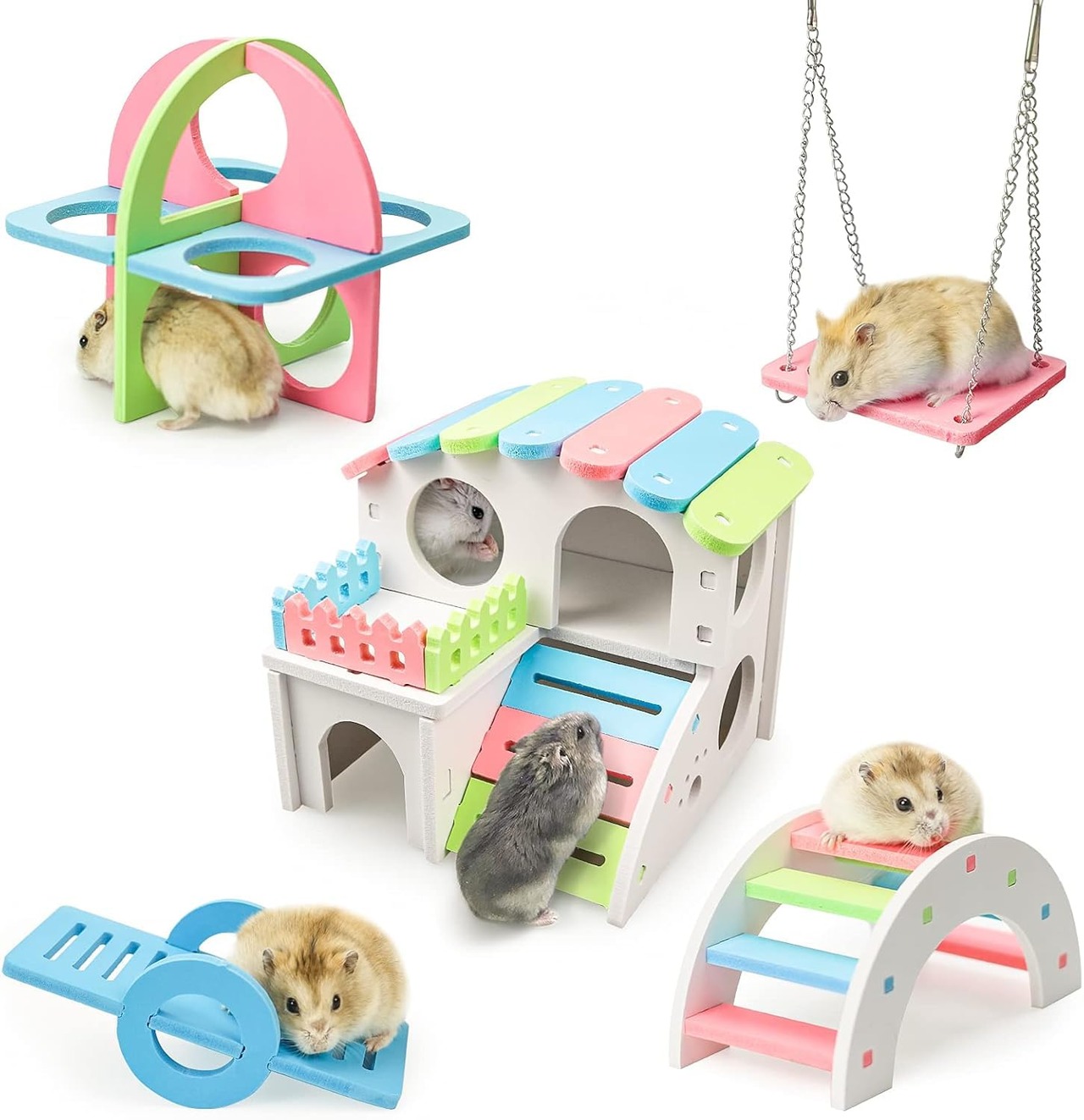 【セール】5点セット ハムスター ハウス ハムスター ケージ 小動物用 おもちゃ 面白い 玩具 レインボーブリッジ ブランコとPVCシーソー ペットスポーツ かわいい 小屋 遊び場 ストレス解消 運動不足解消 おしゃれ 複数カラー (H03) | GIGATERA