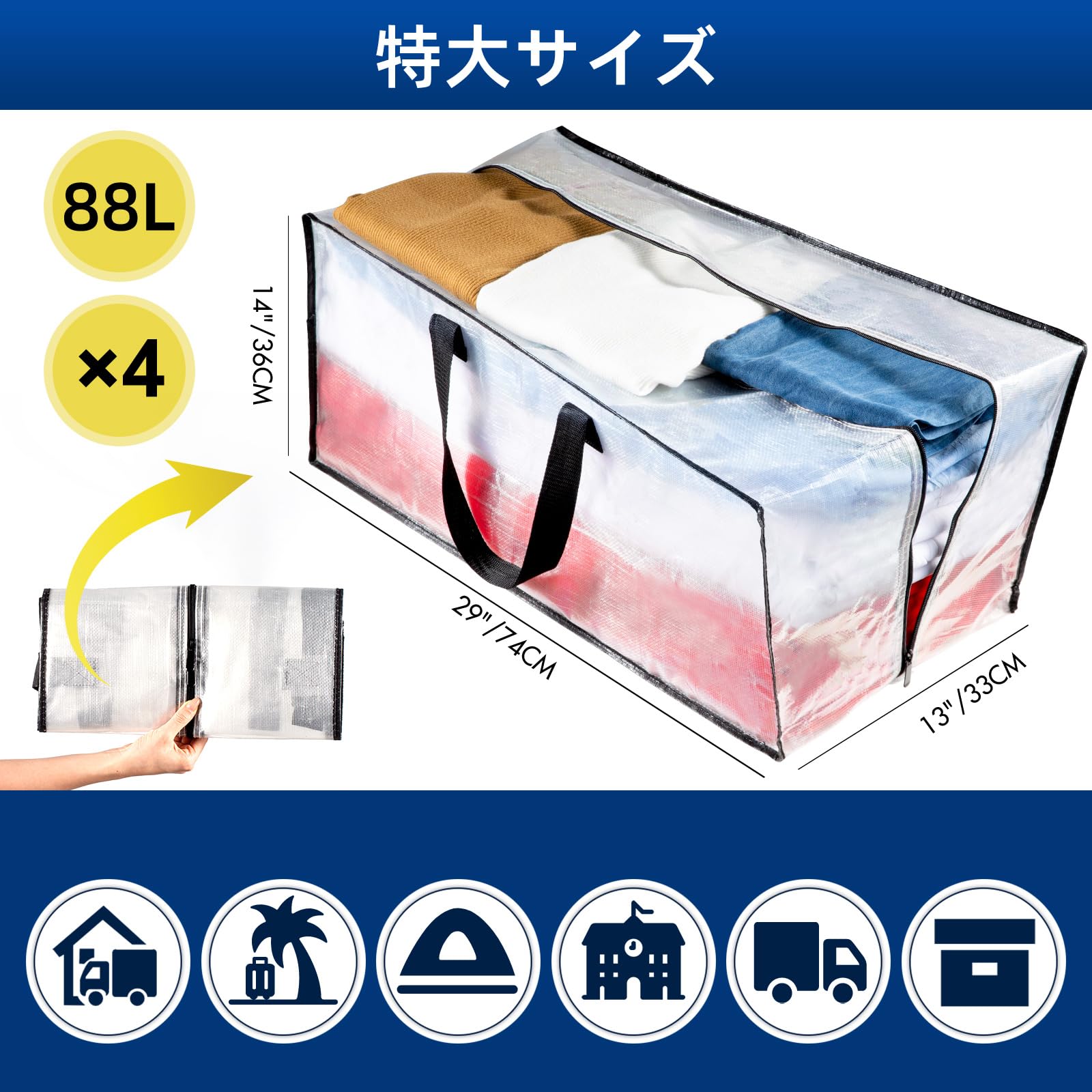 88L大容量、収納力抜群:抜群な特大引越しバッグの寸法:74cm * 36cm * 33cm、4個パック。 両端のジッパーと中央に大きな開口部があるため、衣類、おもちゃ、靴、タオル、必需品、枕、寝具、シーツ、毛布、洗濯物、クリスマス飾りなどを簡単に収納できます