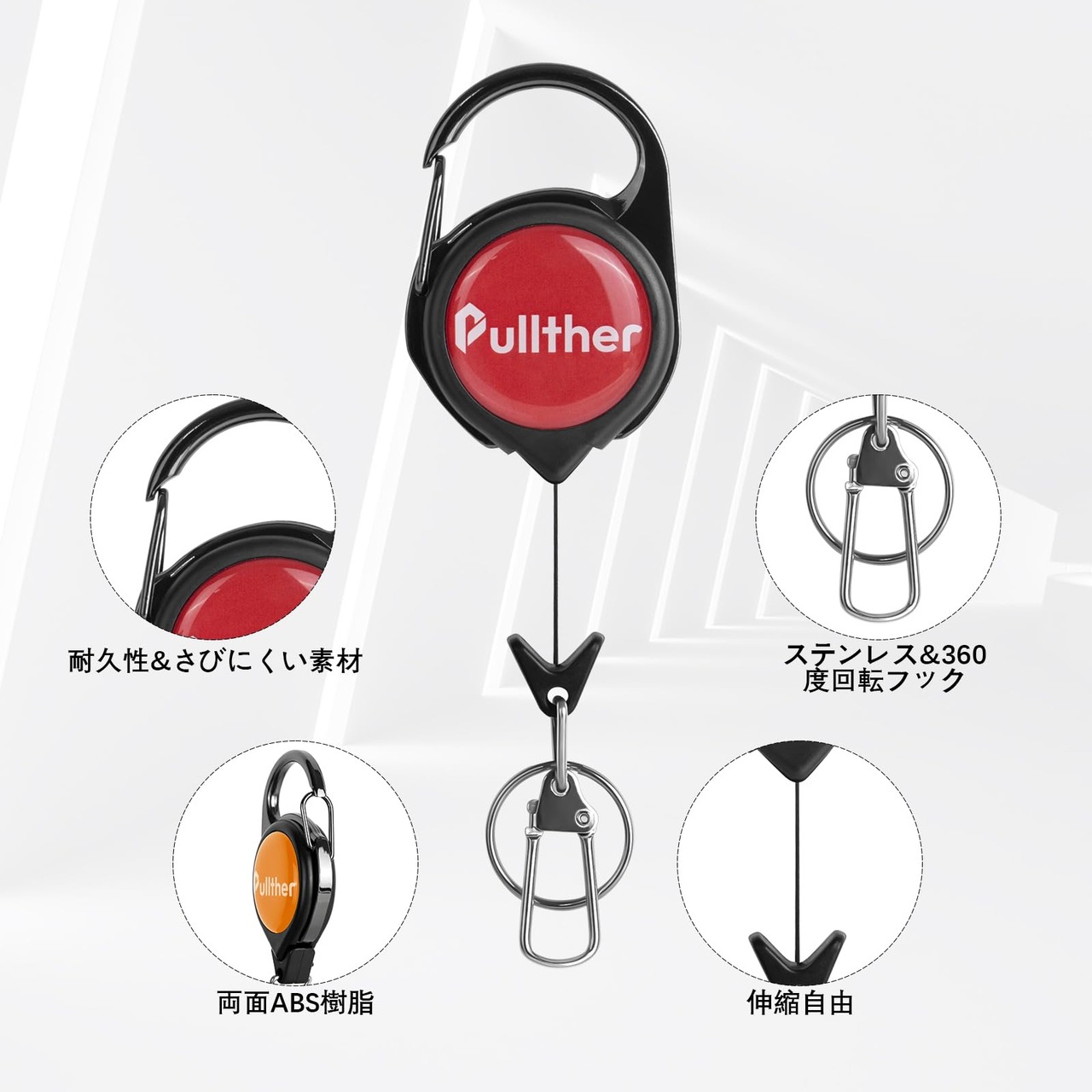Pullther リールキーホルダー ピンオンリール キーリール カラビナ付きリール 紛失防止 伸縮リール 最長65cm 3個入
