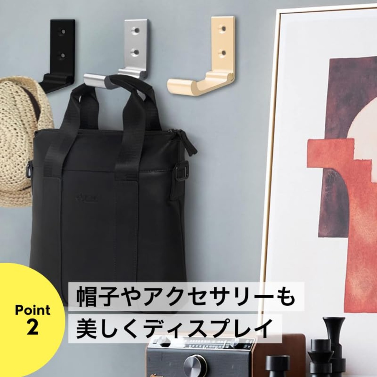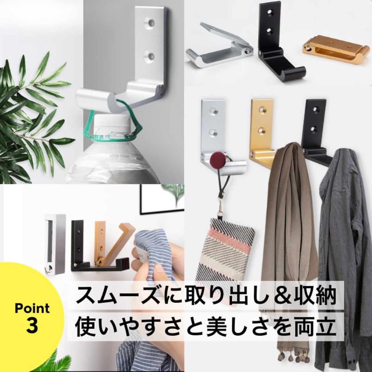 フラットタイプに小回りのきくSサイズが3個セットで新登場!【サイズ・バリエーション】 3種類のカラーと豊富なバリエーションタイプ(ブラックフラット、ブラックフラットS、シルバーフラット、シルバーフラットS、ゴールドフラット、ゴールドフラットS、ブラックウェーブ、シルバーウェーブ、ゴールドウェーブ)、2個セット・3個セット・6個セットから選べます。【サイズ】本体フック部分長さ約7.5㎝、壁面設置部分長さ約6.7㎝、幅約2.5㎝、ネジ穴間隔約2.4㎝ / ネジ約2.8cm / ボードアンカー約3cm 【サイズ(S)】本体 フック部分 長さ約 5.2㎝、壁面設置部分 長さ約 5.1㎝、幅約 2.0㎝、ネジ穴間隔約 2.0㎝ / ネジ約 2.4cm / ボードアンカー約 3cm ※詳細は画像をご参照ください。