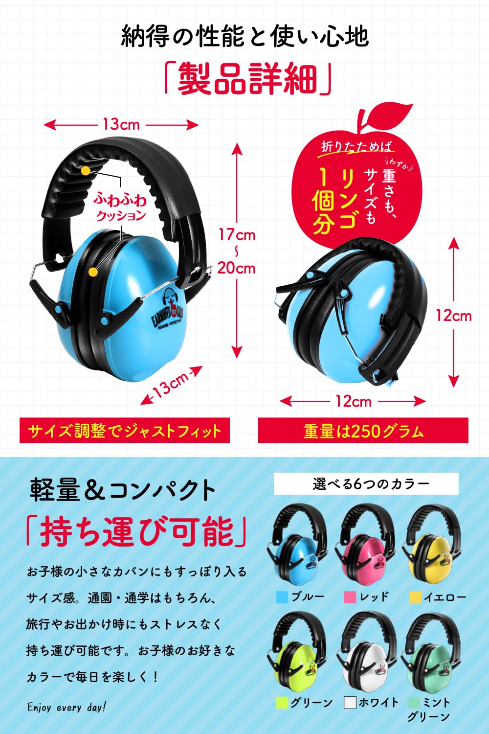 【米国認証済み】米国標準規格ANSI S3.19認証による遮音値21dbのイヤーマフです。お子さまが快適に装着できるよう締め付けの少ない21dbの遮音値で設計しています。