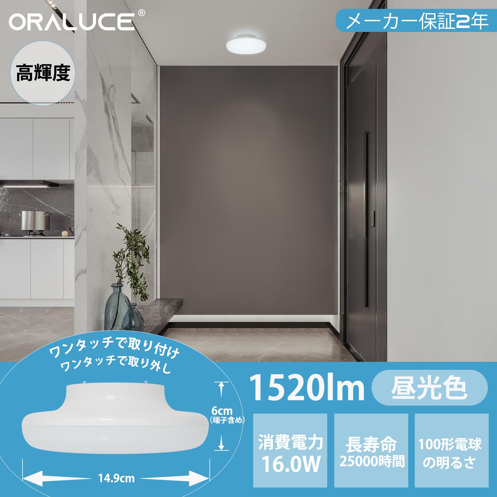 ORALUCE シーリングライト 小型 高輝度 昼光色 16W 1520lm 照明器具 天井 LED ワンタッチ取付 コンパクト 天井照明 廊下、玄関、トイレ、階段、台所 高演色 長寿命 節電対策 SCL16D-01