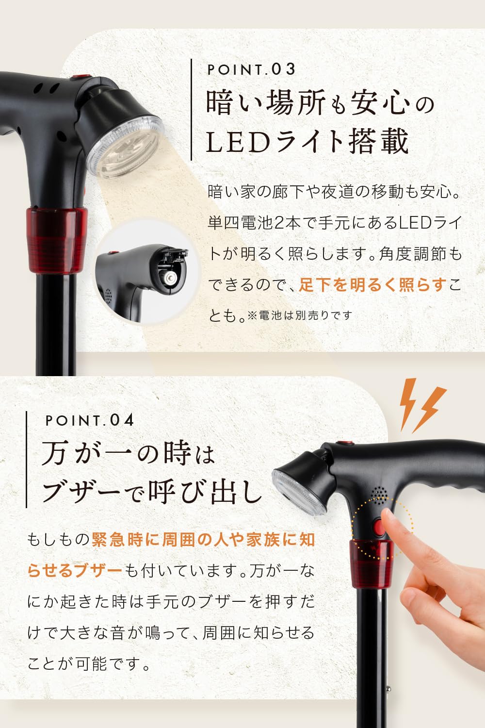 【 LEDライト・救助ブザー搭載(※単4電池2本必要:別売り)】 LEDライトを搭載しており、ワンタッチで簡単に数メートル先を照らすことができます。夜間のトイレや、夜道の移動の際にぜひご活用くださいませ。また、救助ブザーも付いており、緊急時に周囲へ知らせることが可能です。 ※本機能を使用する際は、単4電池が2本必要です(別売り) ※本機能を使用しなくても、杖自体は問題なく利用できます。
