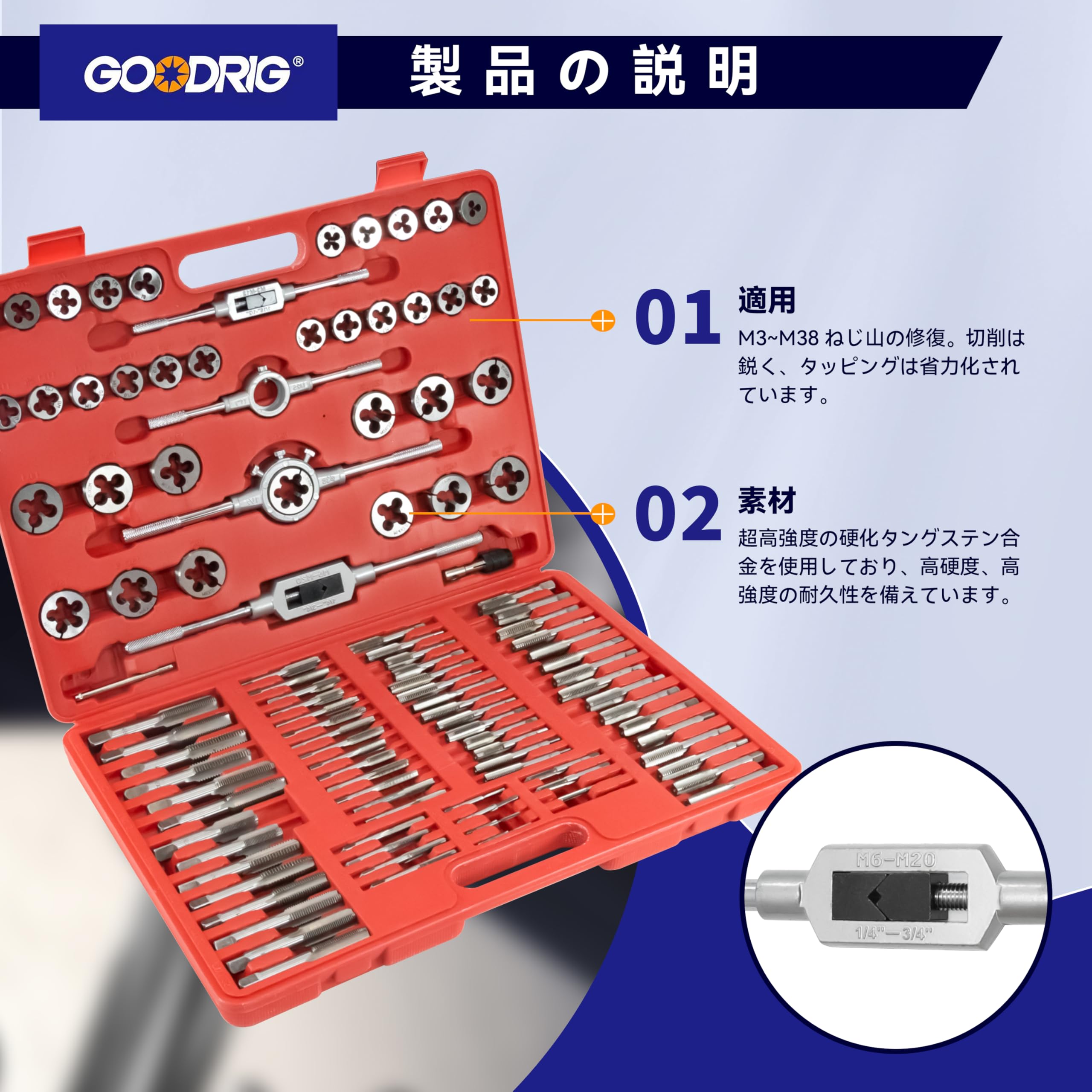 【110個セット】:タップ ダイス(ダイス各1、タップ各2) :M2x0.4、M3x0.5、M4x0.7、M5x0.8、M6x0.75、M6x1.0、M7x0.75、M7x1.0、M8x0.75、M8x1.0、M8x1.25、M9x0.75、M9x1.0、M9x1.25、M10x0.75、M10x1.0、M10x1.25、M10x1.5、M11x0.75、M11x1.0、M11x1.25、M11x1.5、M12x0.75、M12x1.0、M12x1.25、M12x1.5、M12x1.75、M14x1.0、M14x1.25、M14x1.5、M14x2.0、M16 × 1.0、M16x1.5、M16x2.0 / M18x1.5;ダイスハンドル:M25、M38;タップレンチ:M3-12、M6-20;T型タップレンチ:M3-6 。