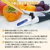 ?【塩分・糖分どちらもOK】レンズ左側の糖度(BRIX)スケールでは高いブドウやバナナも含めすべての果物の糖度が測れます!右側の塩分濃度スケールでは25%までの塩分濃度が測定できます。調味料やスープは溶け込んでいる糖分/油分/塩分/たんぱく質/酸等を合計した濃度になります。配合割合や品質チェックの目訳にご利用ください。測定範囲を超える場合は希釈してください。