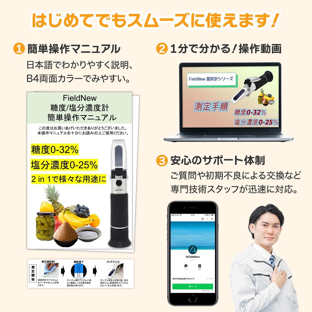 ?【初めてでも簡単測定】液をたらしてのぞき込むだけで糖度/塩分濃度を測定できます。①簡単操作マニュアル、②[1分で分かる]動画説明③公式LINEでのサポートで、誰でも簡単に操作できます。