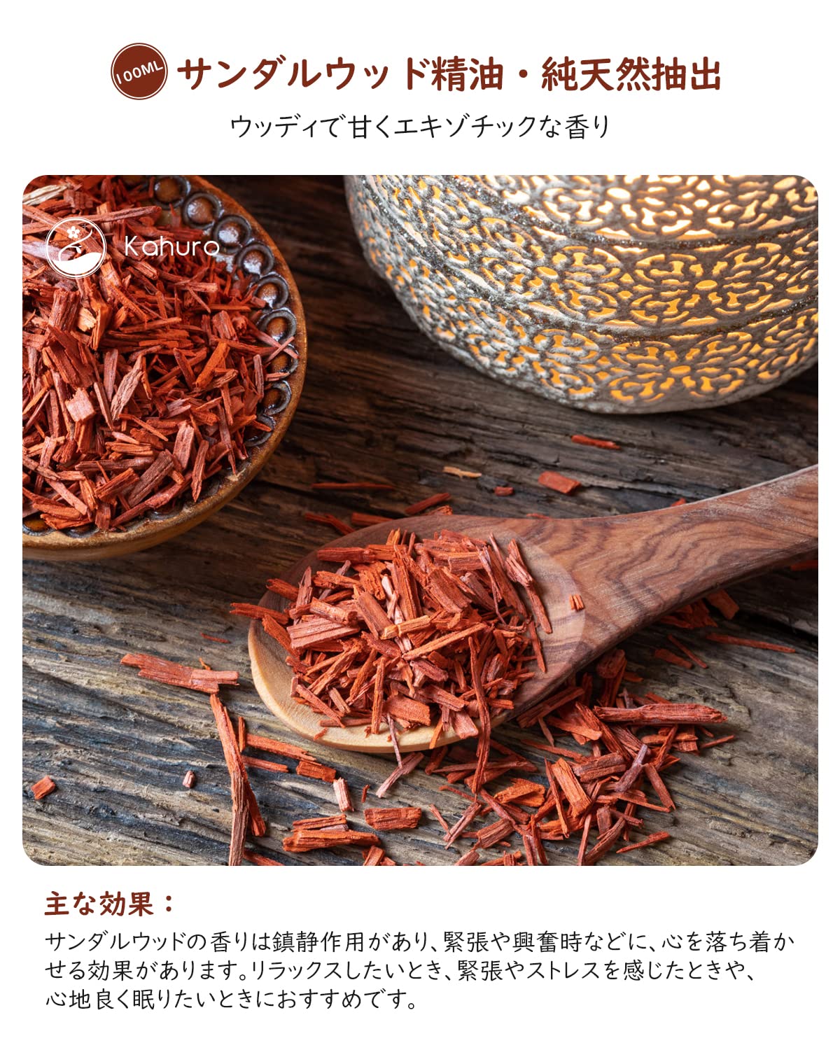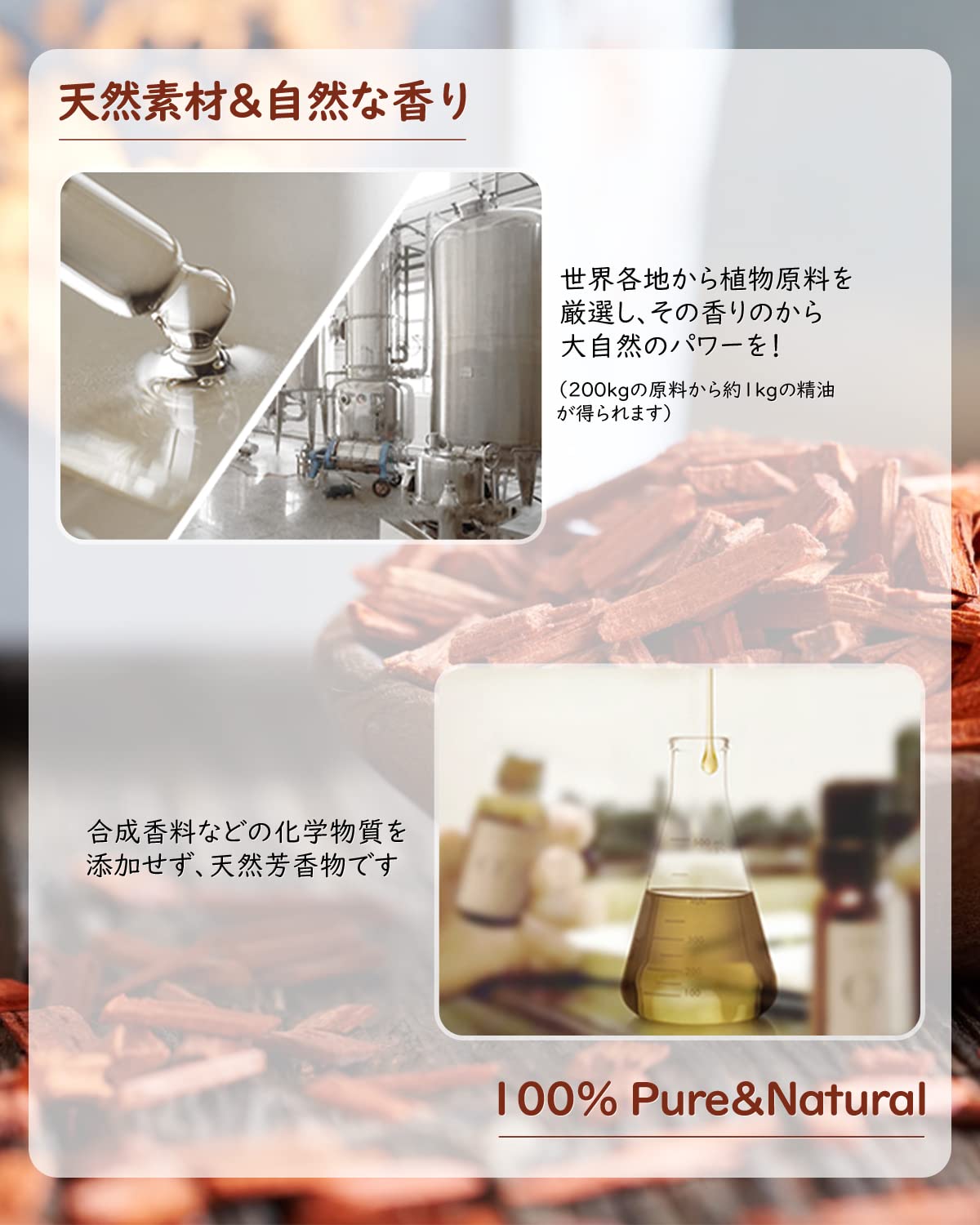 【100%純天然抽出】サンダルウッド精油は水蒸気蒸留法を用いて、サンダルウッドの心材から抽出され、合成香料を一切使用せず、天然芳香物です。世界各地から植物原料を厳選し、200kgの原料から約1kgの精油が得られ、その天然の香りから大自然の魅力を!