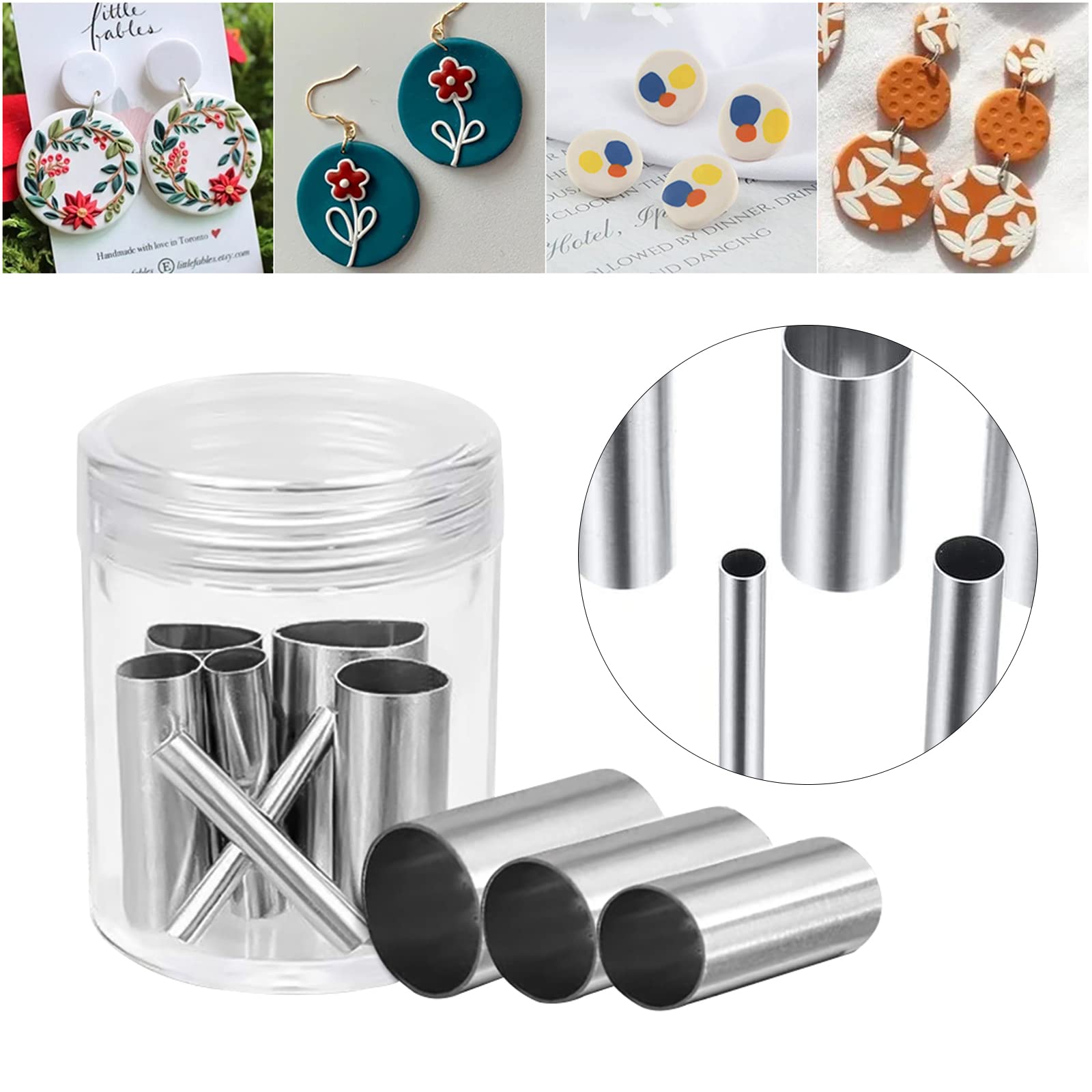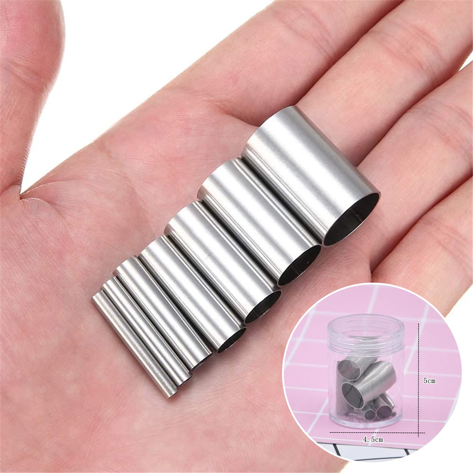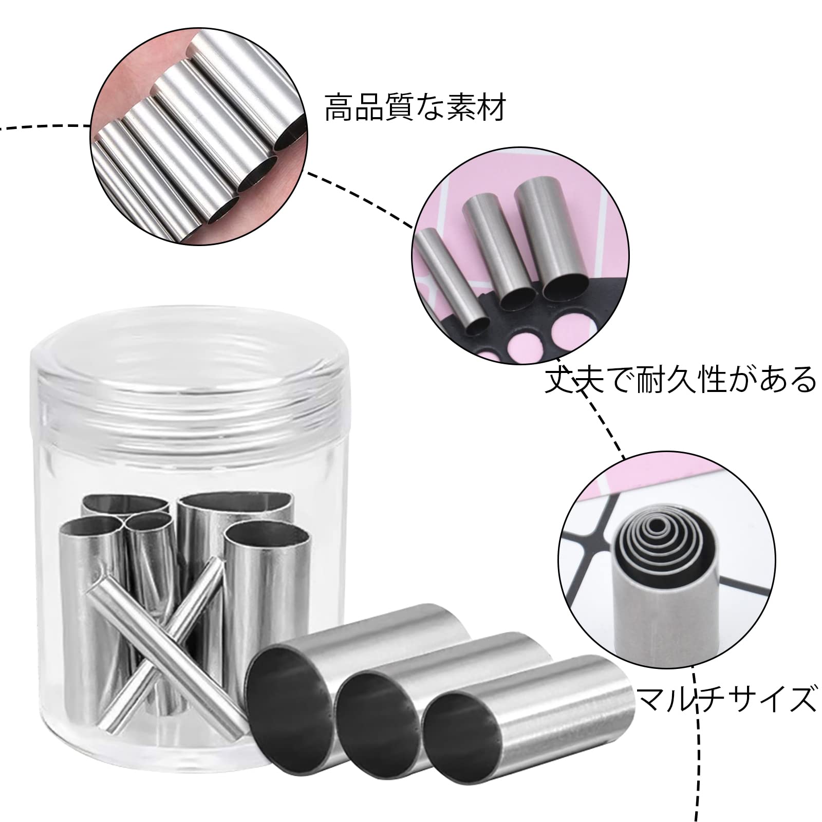 サイズ:粘土カッターの高さ:25mm 直径:3mm、4mm、6mm、8mm、10mm、12mm、16mm ケースのサイズ:直径4.5cm*高さ:5cm