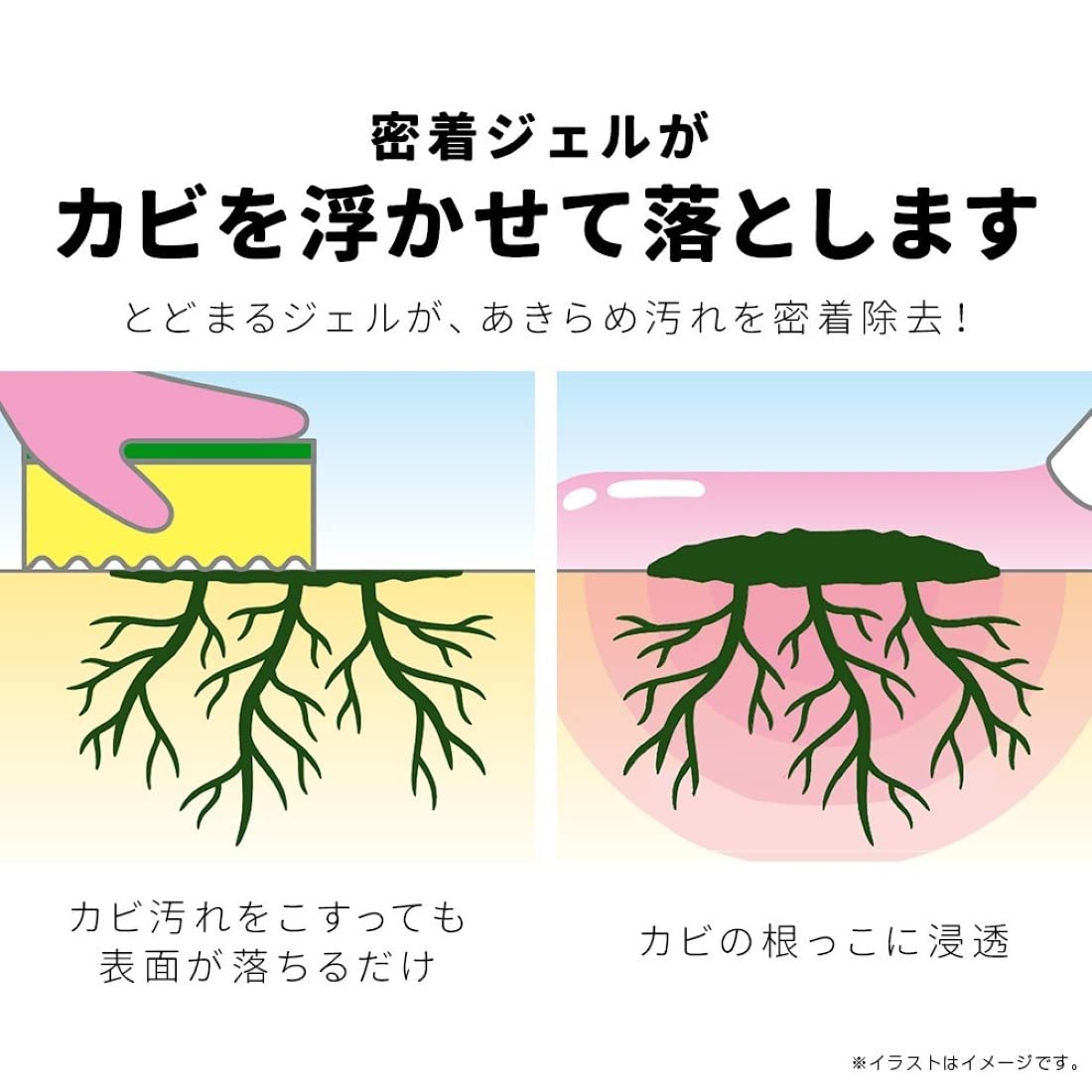 【密着して落ちる】密着ジェルがカビを浮かせて落とします。シリコンコーキングやゴムパッキン等のガンコなカビを除去!ツンとしたニオイが少ない低臭タイプ。