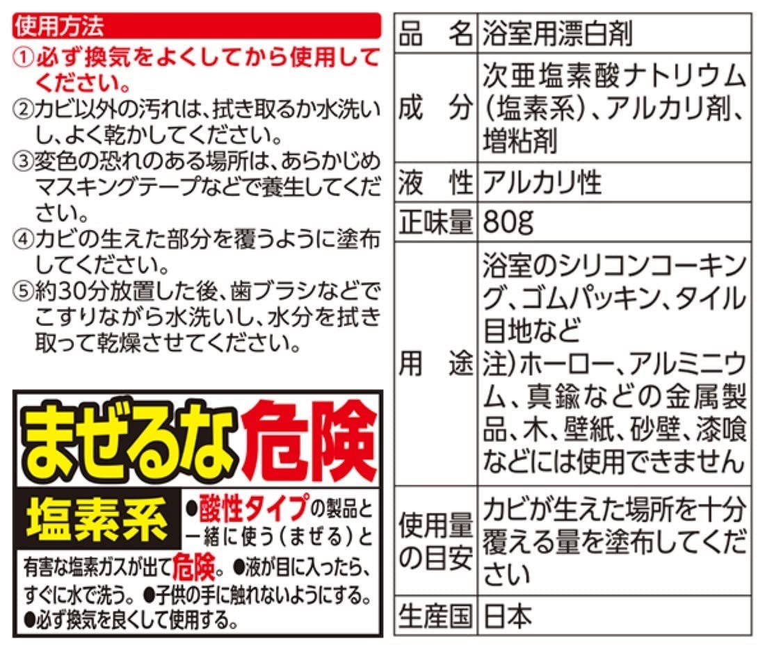 【商品仕様】内容量/80g、成分/次亜塩素酸塩・増粘剤・着色料・防カビ剤・水酸化カリウム(0.9%)・界面活性剤(ポリオキシエチレンアルキルエーテル)・水、液性/アルカリ性、用途/浴室のシリコンコーキング、ゴムパッキン、タイル目地など、適さないもの/ホーロー、アルミニウム、真鍮などの金属製品、木、壁紙、砂壁、漆喰など、使用量目安/1mあたり約10g、原産国/日本