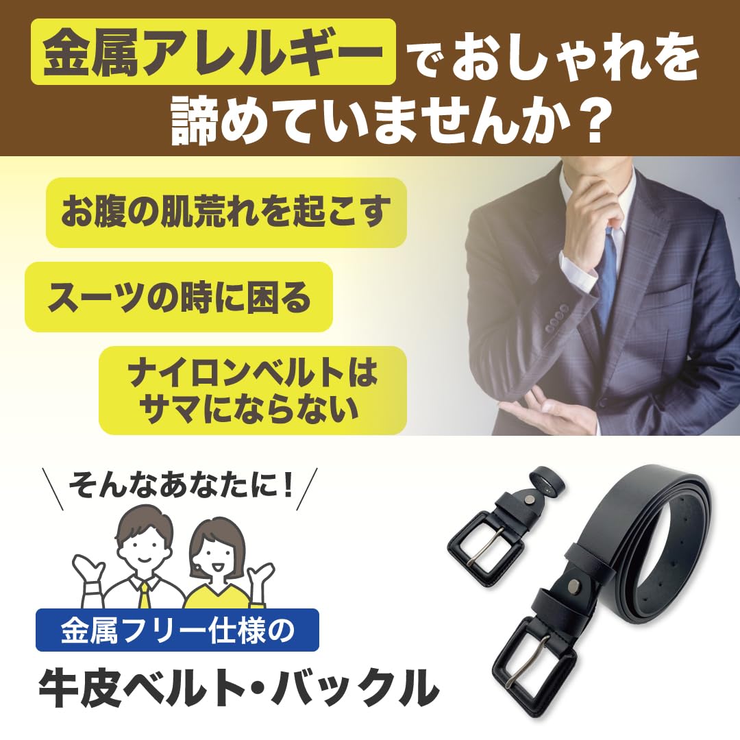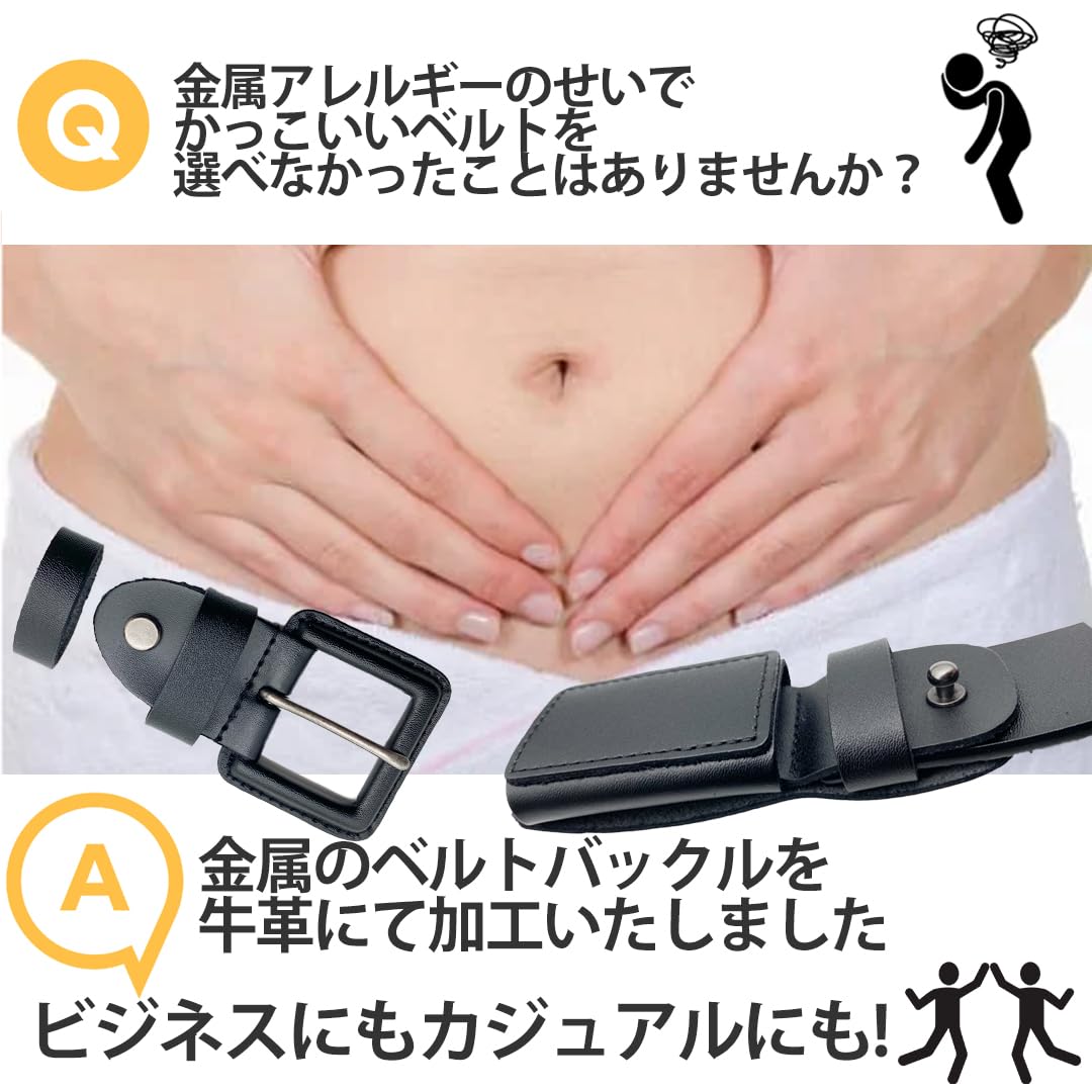 金属のバックルせいで普通のベルトを使うとお腹が荒れてしまう!カッコいいベルトが使えない! そんな悩みはございませんか?このベルトバックルは総牛革タイプのベルト部分が皮製の品を使った