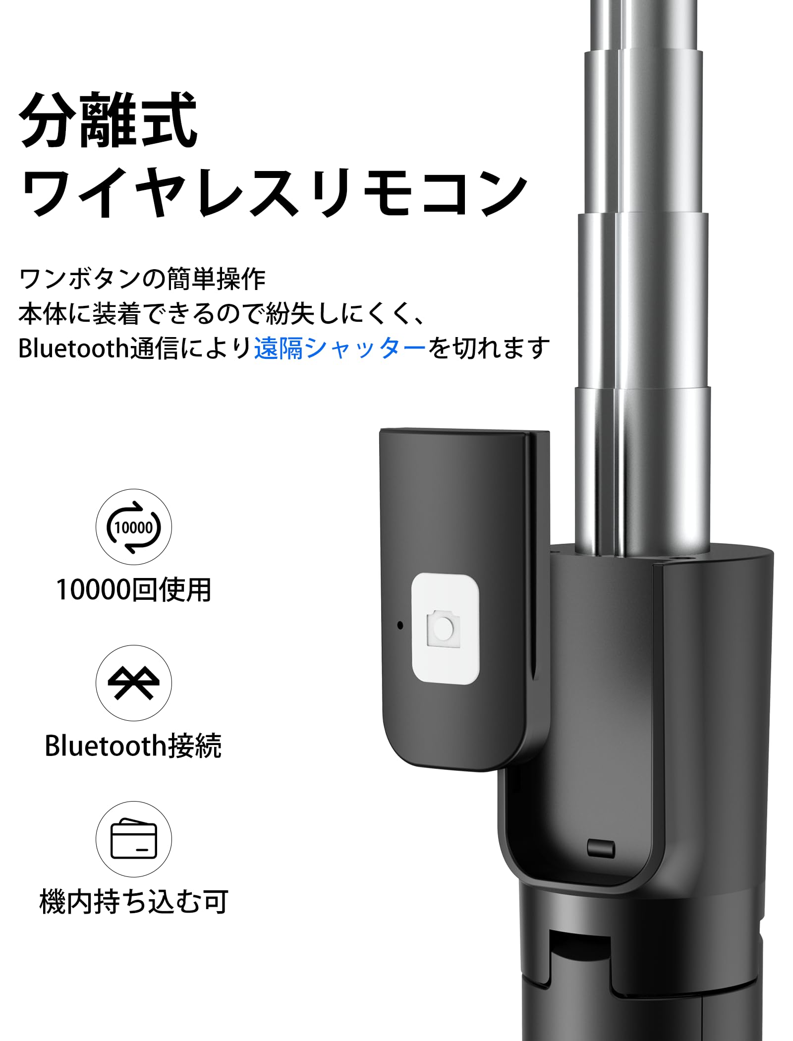 【2025新開発・三脚・一脚兼用】自撮り棒のグリップ部分をパカッと開きと三脚に変身します。手持ちの使用だけでなく、Bluetoothリモコンと三脚一体の高級設計で、遠距離でコントロールできます。三脚スタンド付きで平面に置き、人に写真を頼まなくても、自由自在に友達や家族全員の記念写真を撮影できます。三脚の先に滑り止めゴム付き、しっかりと地面に固定されるので安定感が抜群です。