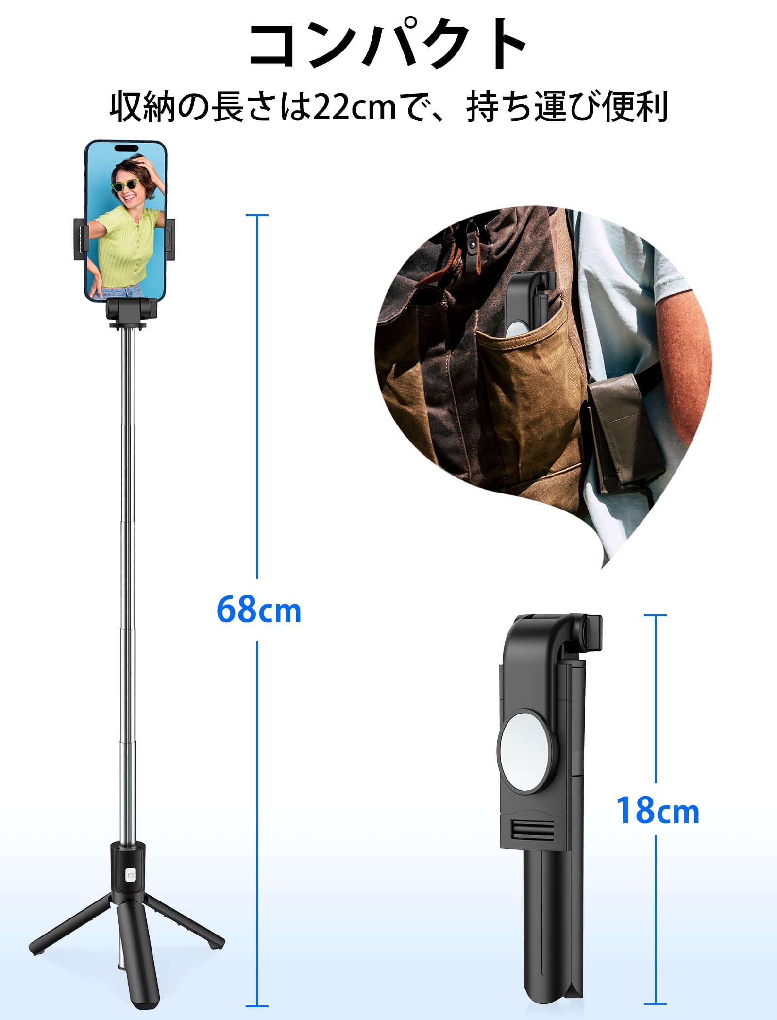 【安定性抜群&自由調節】セルカ棒は業界で耐久性一番のステンレス鋼を採用、軽量と安定の両立を実現しました。三脚底部は滑り止めゴム素材の使用で、平たい地面はもちろん、起伏のある地面などの滑りやすい環境でも安定に撮影できます。自撮り棒は最大68cmまで伸ばすことができます。より良い視野を得ることができます。また、スマホを挟むクランプは360度自由回転出来ます。最適な角度を調節して、一番楽しい瞬間を記録できます。