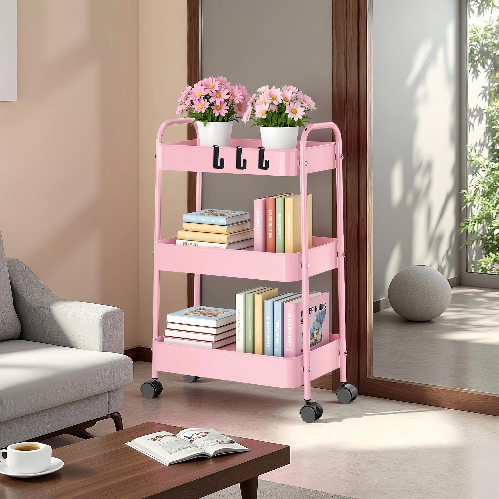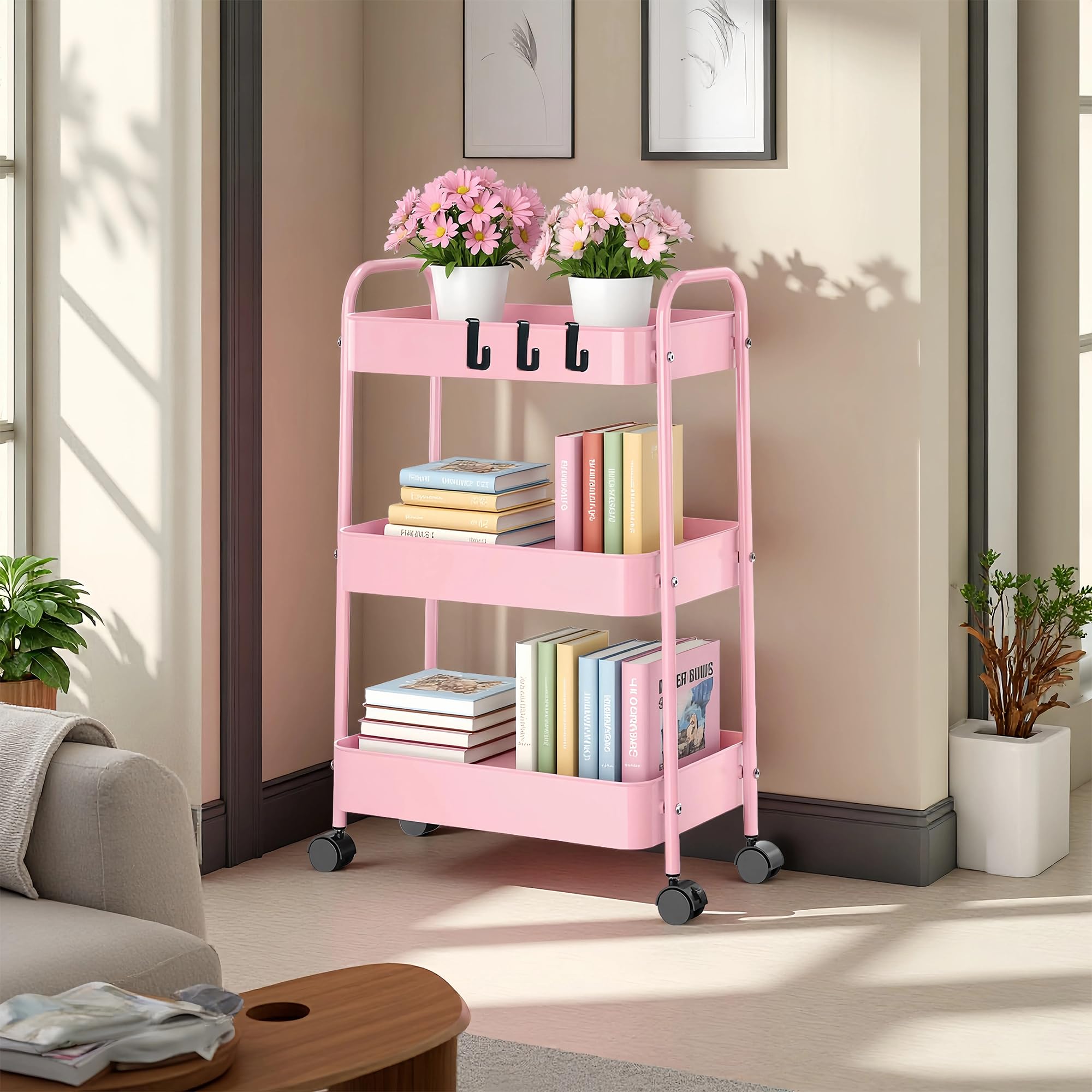 【数量限】ピンク 3段 キャスター付きワゴン 幅45cm×奥行30cm×高さ69cm 多用途 キッチン コンパクト収納 省スペース スリム 移動式 引出し付き ランドリー 洗面所 隙間収納 ベビー オフィス スチールラック 収納ワゴン キャスター付きラック | GIGATERA