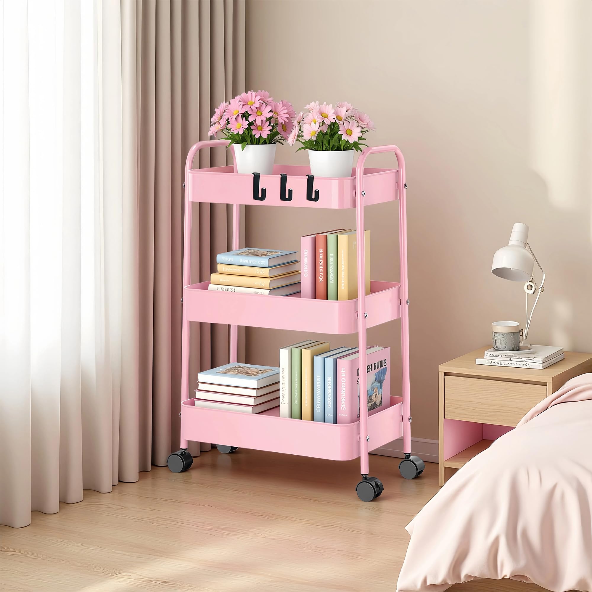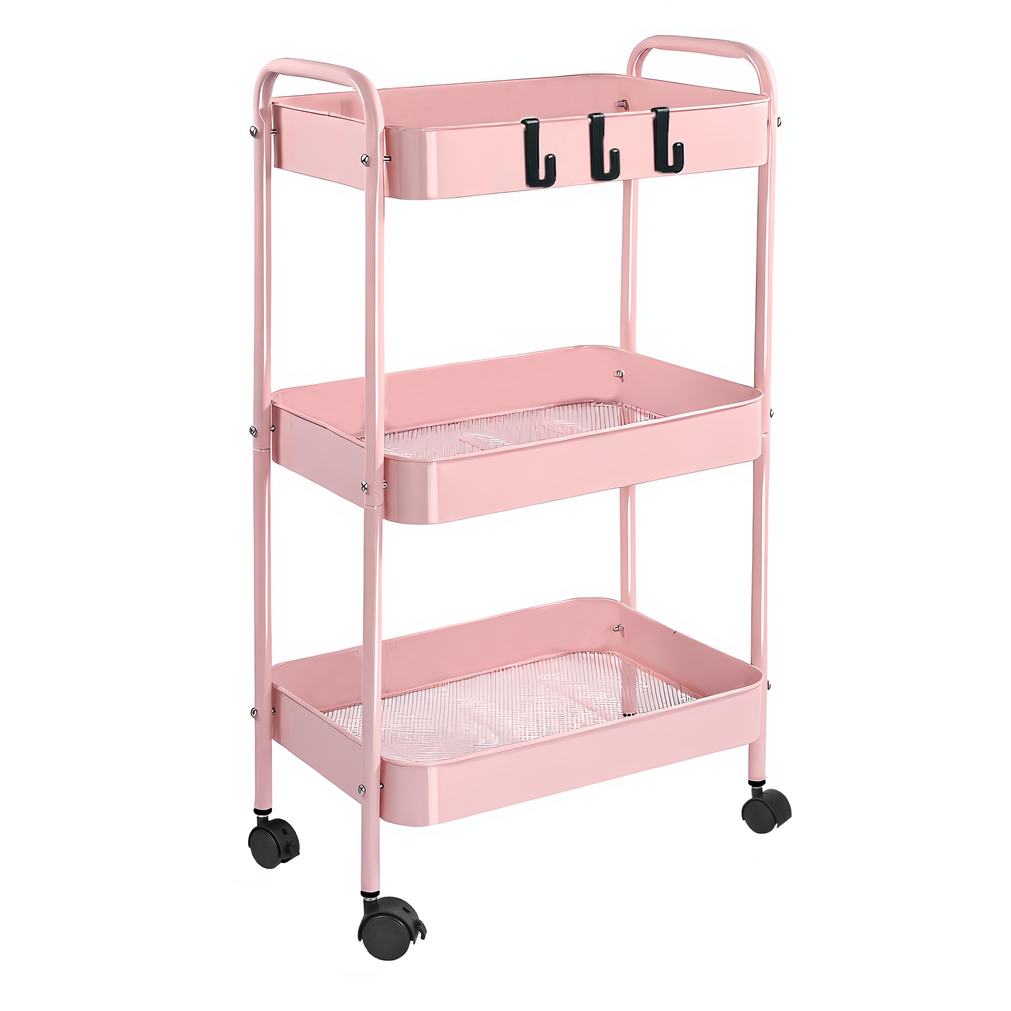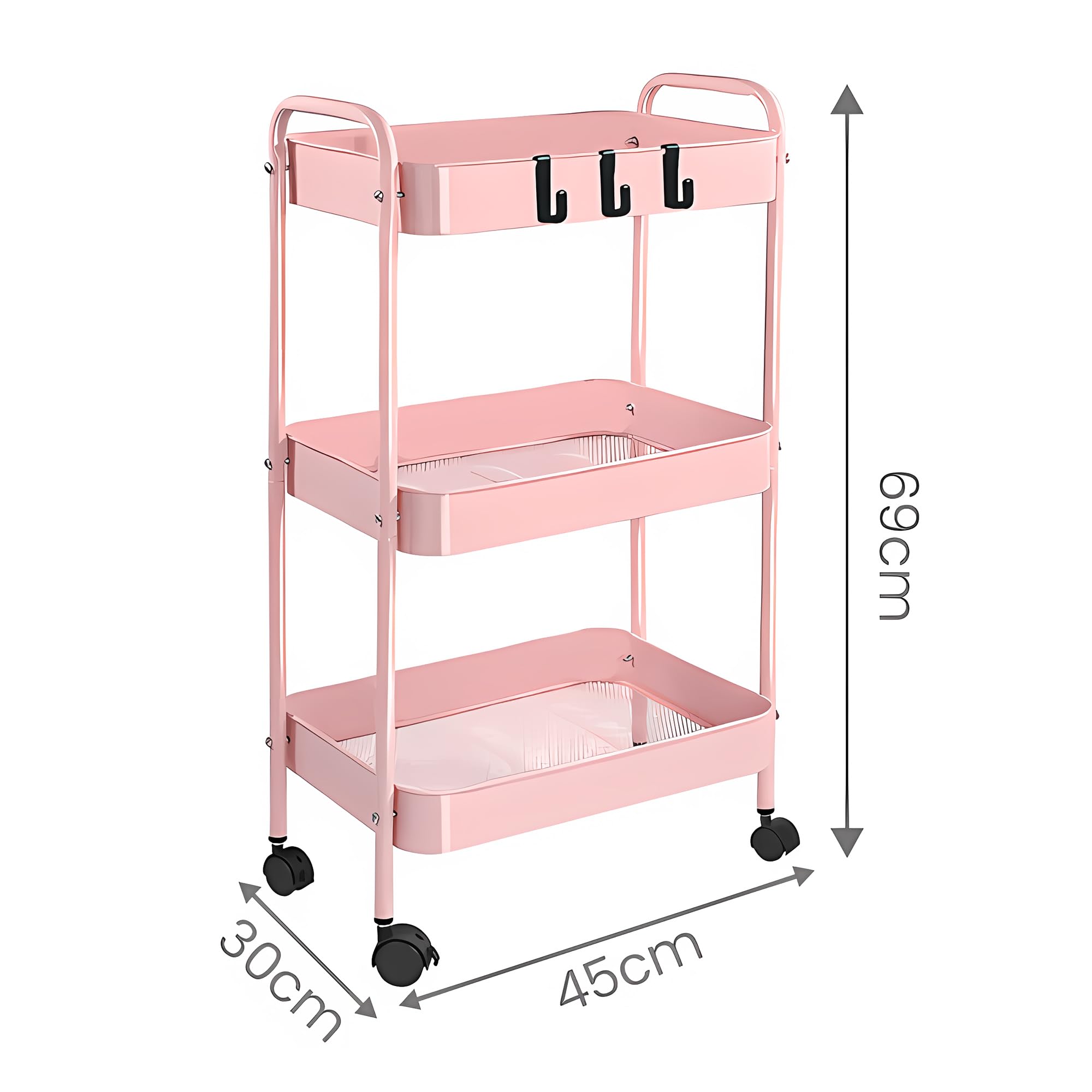 ピンク 3段 キャスター付きワゴン 幅45cm×奥行30cm×高さ69cm 多用途 キッチン コンパクト収納 省スペース スリム 移動式 引出し付き ランドリー 洗面所 隙間収納 ベビー オフィス スチールラック 収納ワゴン キャスター付きラック