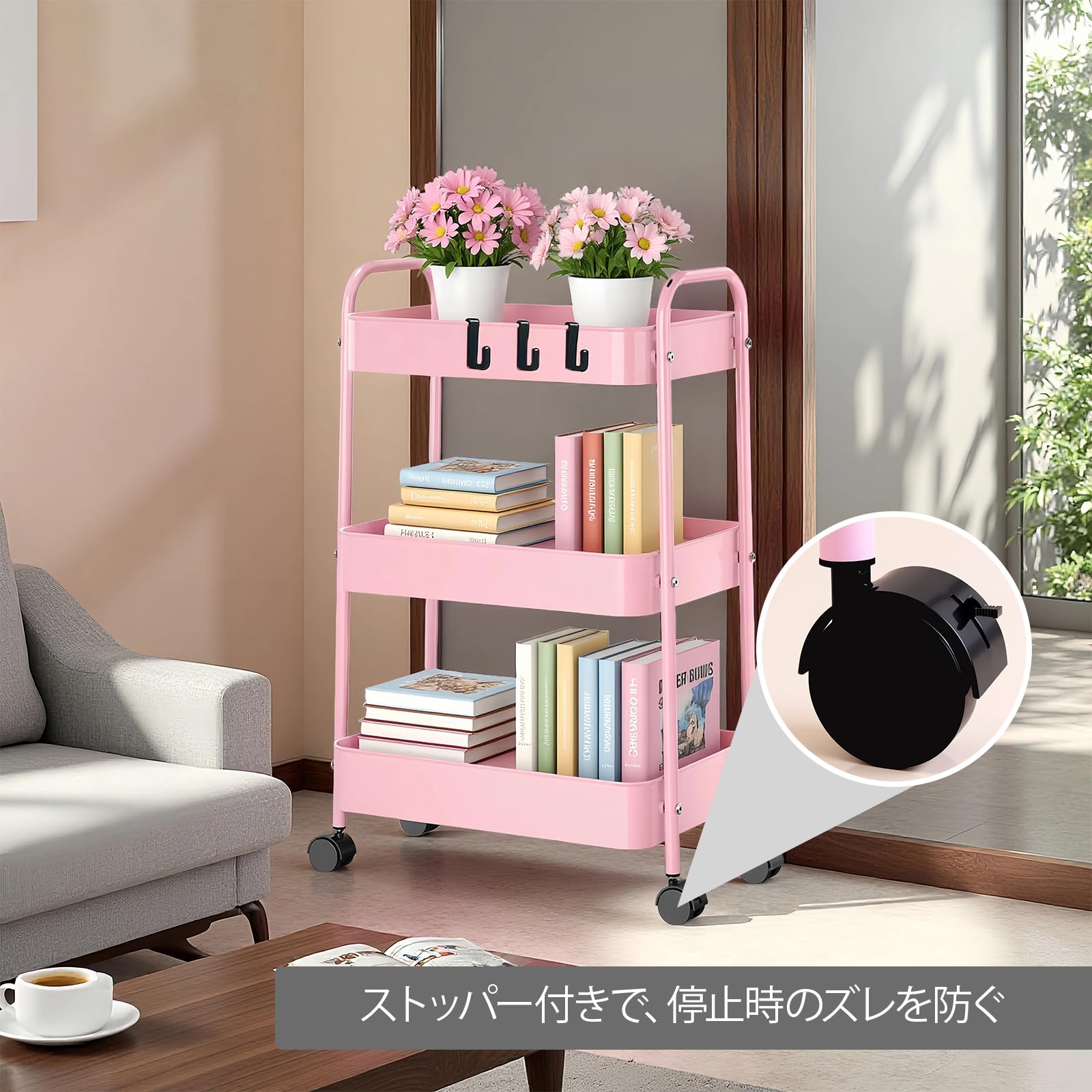 【移動性と基本機能】ピンク 棚付き3段ラックは、キッチンワゴンとして調味料ラックやシンク下収納に最適。幅30cmのスリム設計で隙間収納可能。キャスター付きワゴンだからリビングからベッドルームまで移動式ラックとして楽々移動。省スペース 収納でキッチン 収納の悩みを解決。