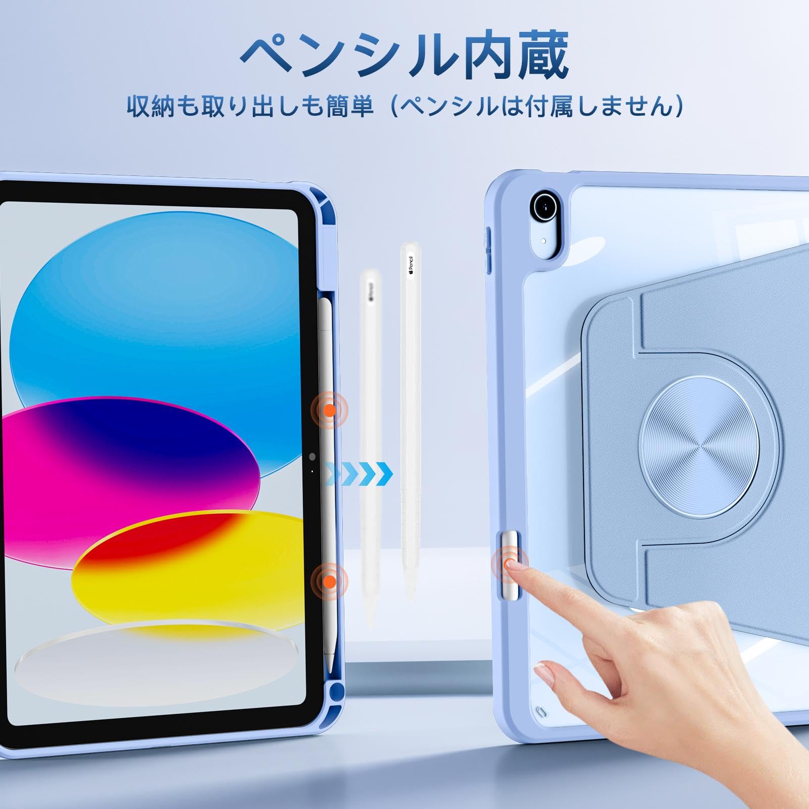 【ペンシル収納】対応iPad ケース 第11世代を装着したままで、Apple Pencil 1のホルダーと収納スペースが備えられています。これにより、Apple Pencilの紛失を防ぐことができます。