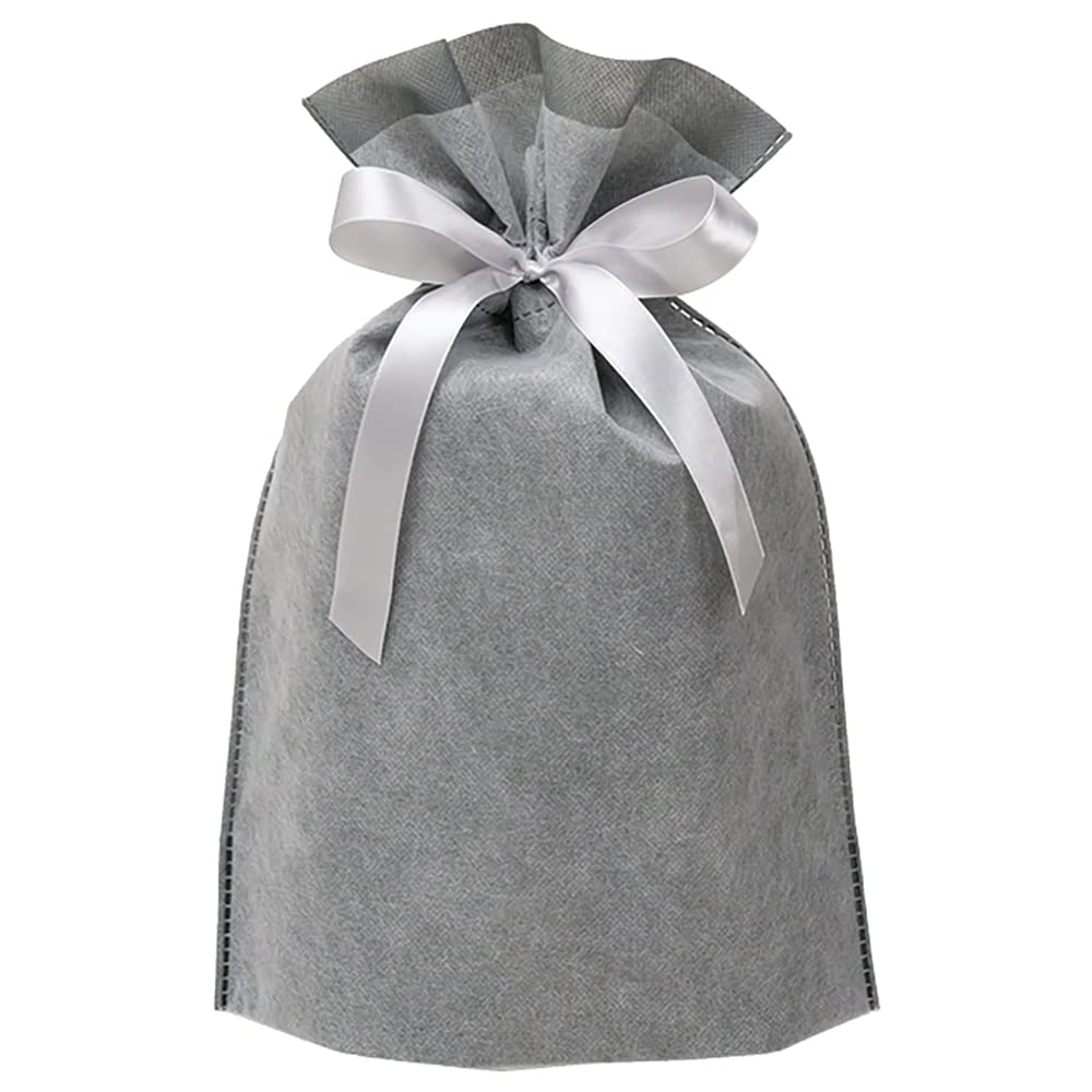 グレーの無地の無地のリボン付巾着バッグです。ベースのグレーの不織布に薄手の白の不織布を重ねることにより、シンプルながら上品で高級感のあるギフトバッグに仕上げました。