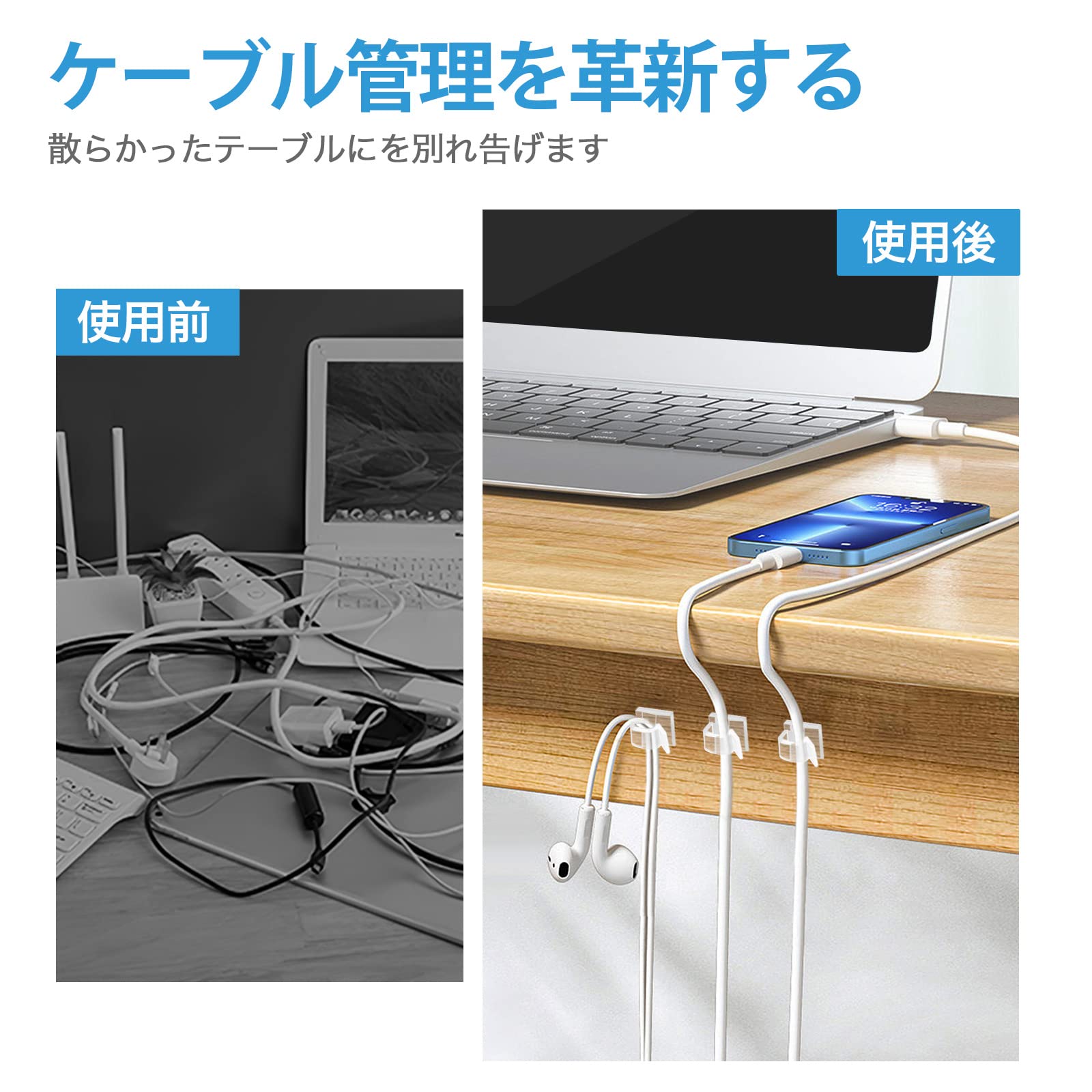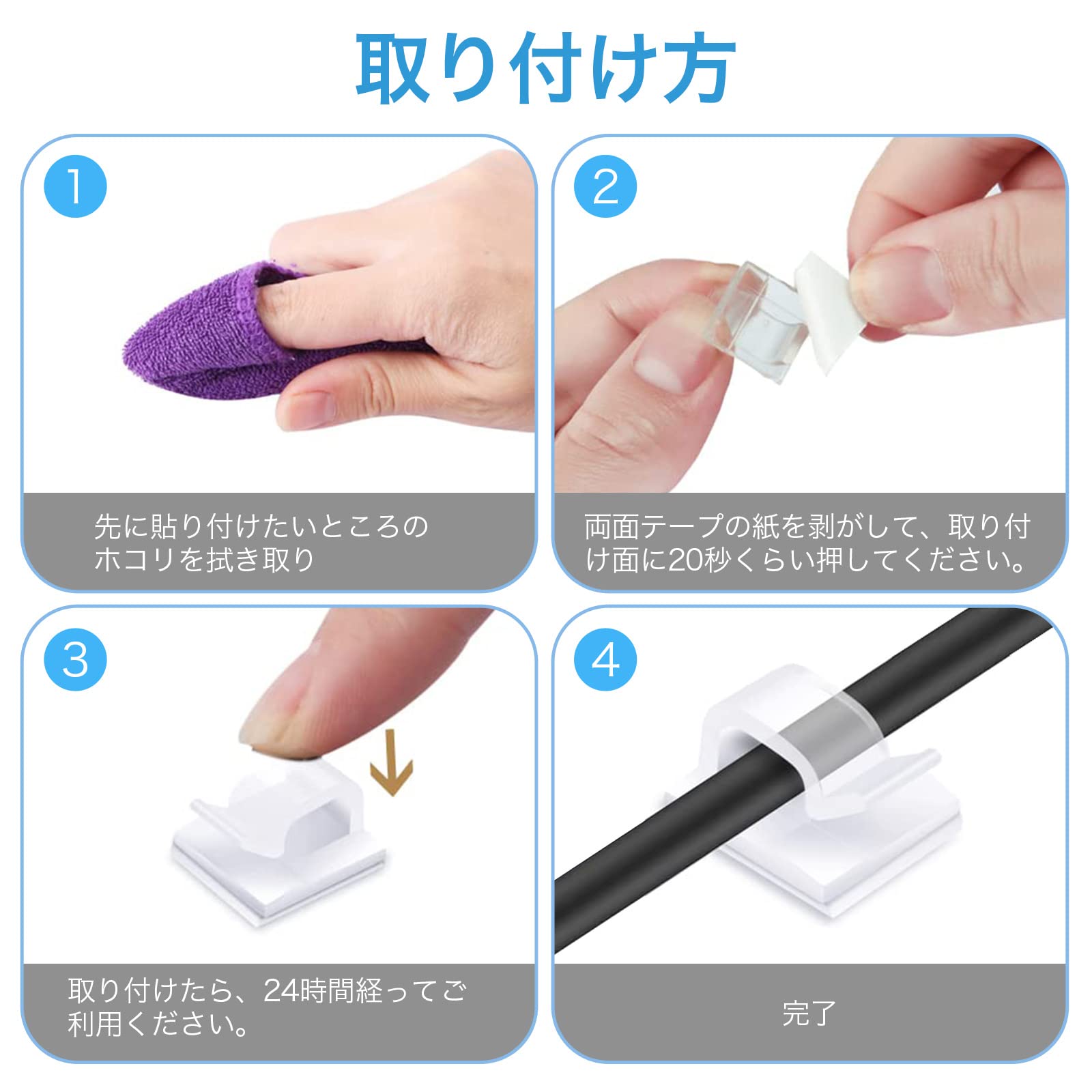 デスク周りの整理整頓アイテムとして人気のケーブルクリップ - LANケーブル、電源コード、照明コード、携帯やスマホンの充電コード、PC周辺のコードなどのケーブル類がすっきり整理!