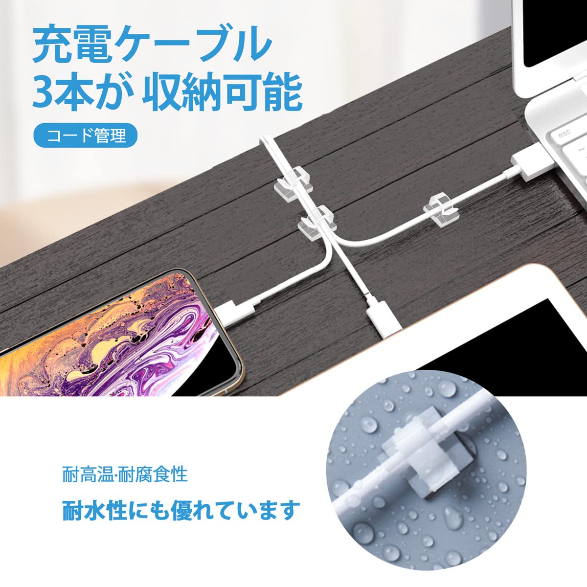 「コード収納する部分の対応幅:8mm 対応高さ:4.5mm」一度に3つのスマホケーブルをはめ込めるので、ノートPCに接続する充電コードやモニター用ケーブルなど、いつも使うケーブルやコードをスッキリとまとめられます。