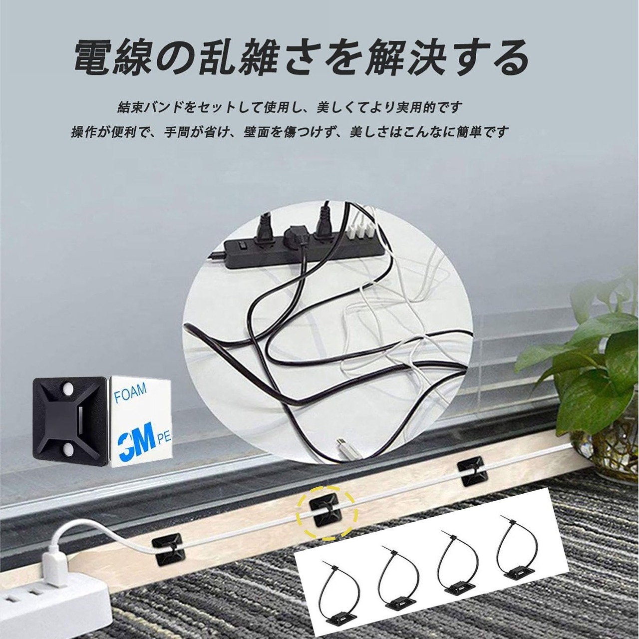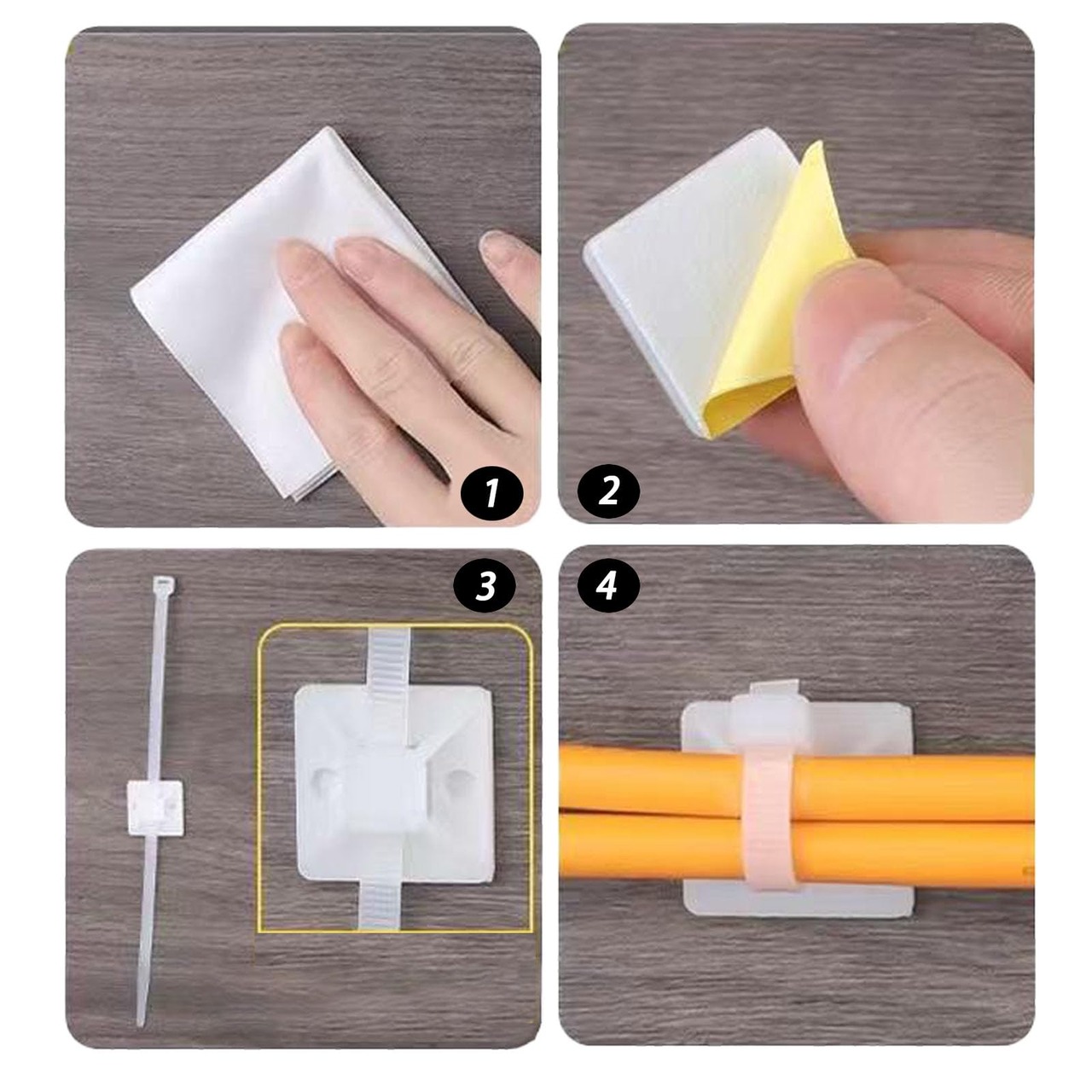 【強力粘着性】台座は強力粘着性両面接着剤で作られており、金属、プラスチック、木材、ガラスなど様々な滑らかで平らな表面に適しています。また、結束バンドのデザインは、ケーブルと接着面を剥がしても傷がつかない。