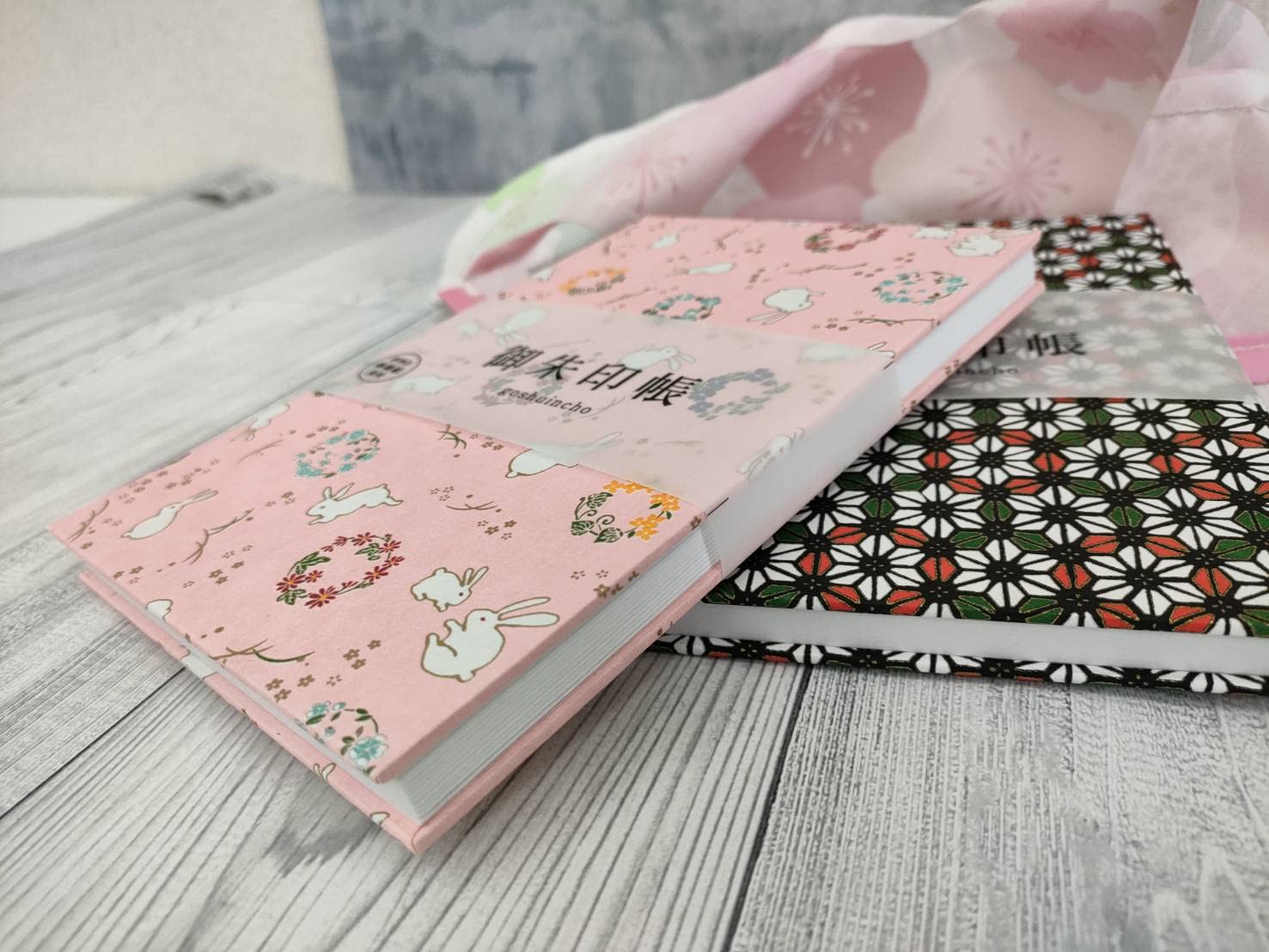 蛇腹式 24折(両面用) ※片面24頁、両面48頁 中紙は蛇腹式で、裏写りしにくい二重の袋綴じ状になっています。 表と裏、両面ご使用いただけます。 縁起の良い伝統模様をあしらった特大朱印帳 伊予の奉書紙を使用し、蛇腹式で裏写りしにくい二重の袋綴じ状になっています。伝統模様 特大朱印帳シリーズ ウサギと花 全二色 水色 桃色 干支の動物でもあるウサギは、その飛び跳ねるしぐさから「跳躍」を表しているとされています。 前進や、発展を願う方にピッタリのアイテム。 ・おまつり花火 全二色 黒 赤 ”花火”柄は、夏の風物詩であり、 その柄を御朱印帳にすることで季節を感じることのできるものです。 ・てまり 全三色 紺 赤 黒 てまりは長い糸で作られることから「縁結び」を司るとされ、円満を連想させることもあり縁起物として 扱われてきました。良縁を願って子供服の柄とすることもあったようです。