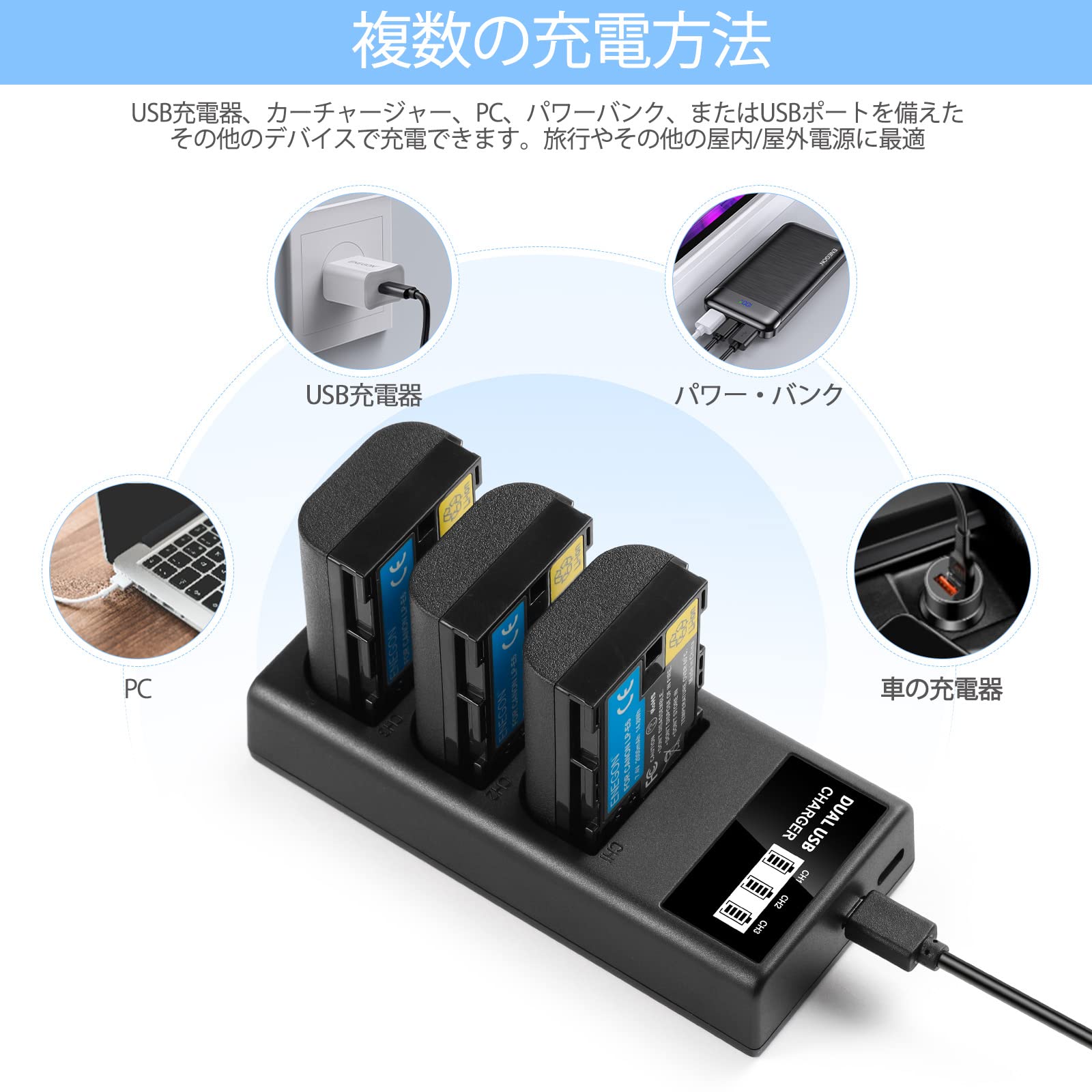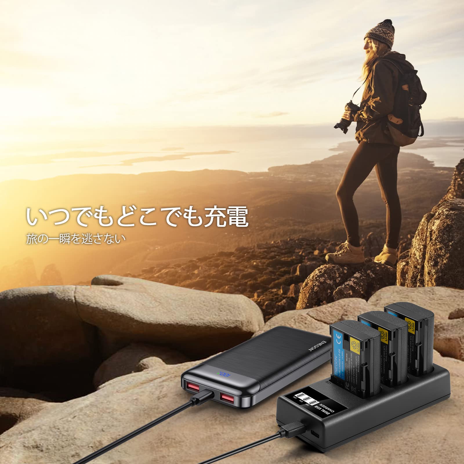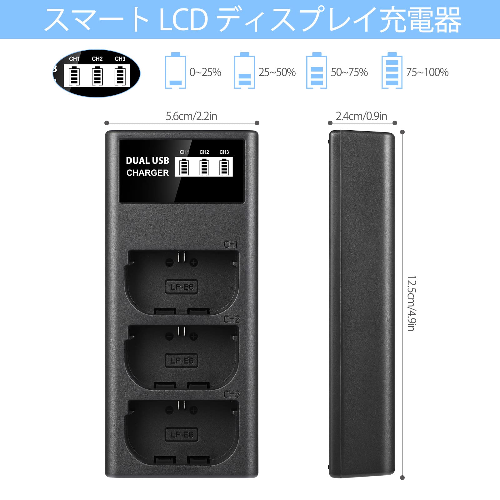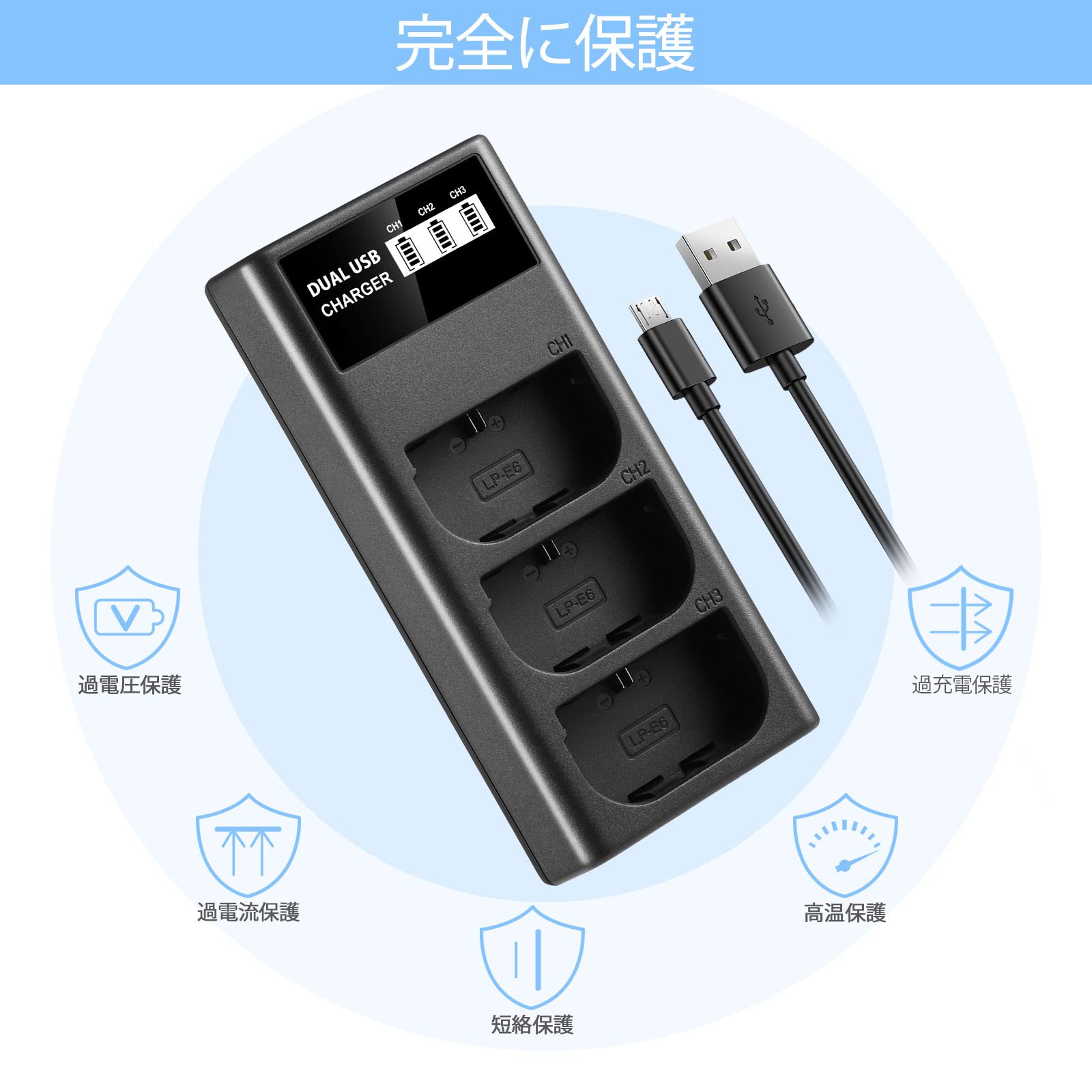 ENEGON LP-E6 LP-E6N LP-E6NH 3チャンネル LCD 互換充電器 USBチャージャー Canon EOS 5D Mark II/III/IV, 6D/6D Mark II, 7D/7D Mark II, 60D/60Da, 70D/70D Mark II, 80D, 90D, 5Ds/5Ds R, Ra, R, R5, R6/R6 Mark II, R7