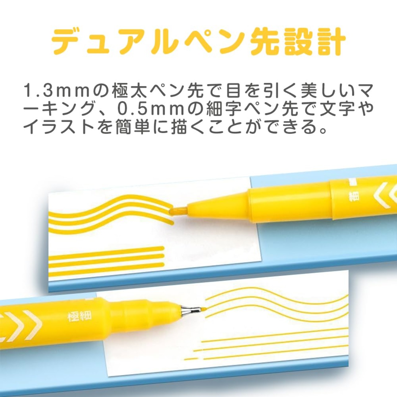 【デュアルペン先設計】1.3mmの極太ペン先で目を引く美しいマーキング、0.5mmの細字ペン先で文字やイラストを簡単に描くことができる。