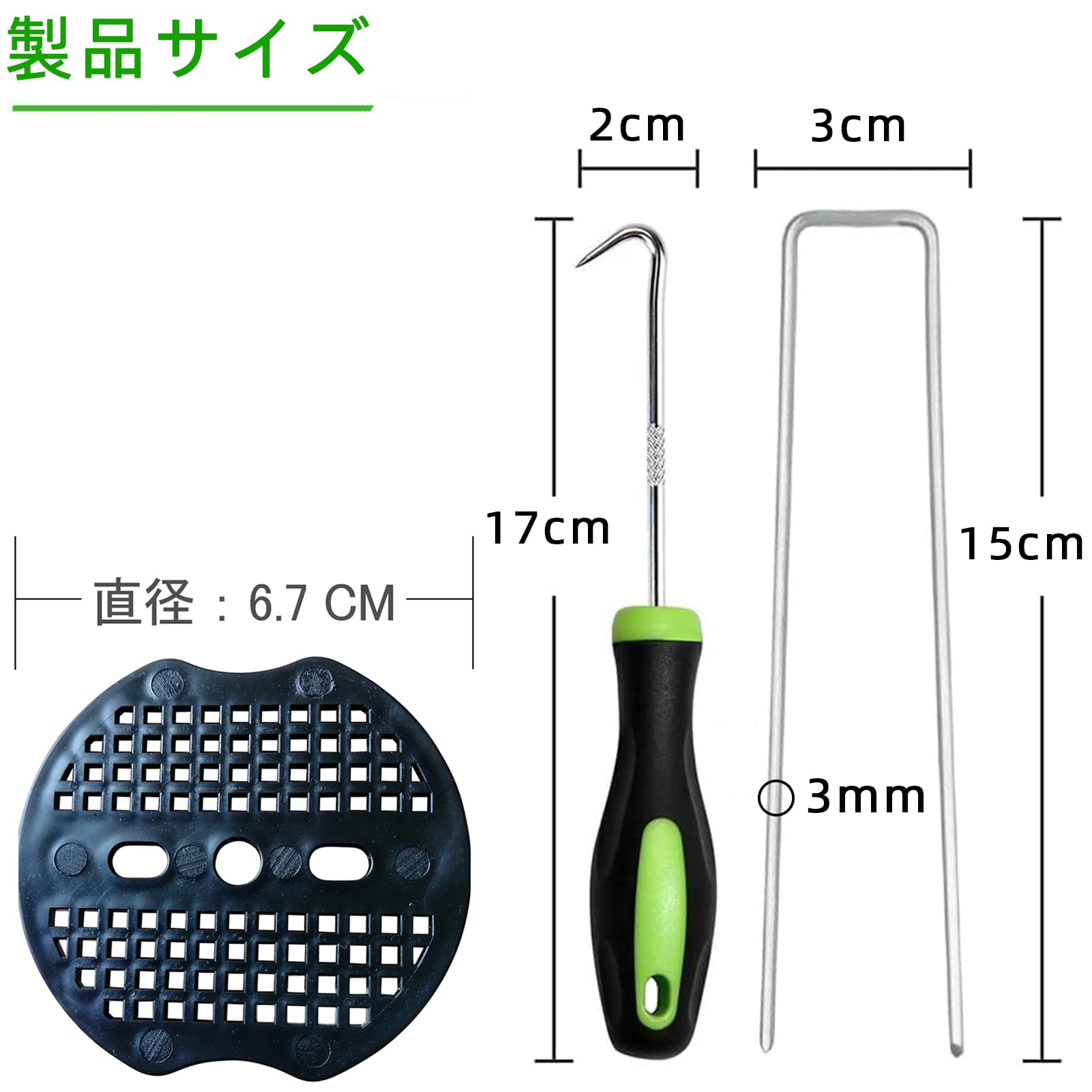 セット内容:U型釘杭:縦15センチx横3センチx直径約3ミリ、200個。黒い丸200個とフック1個とディスペンサー手袋も含まれています。
