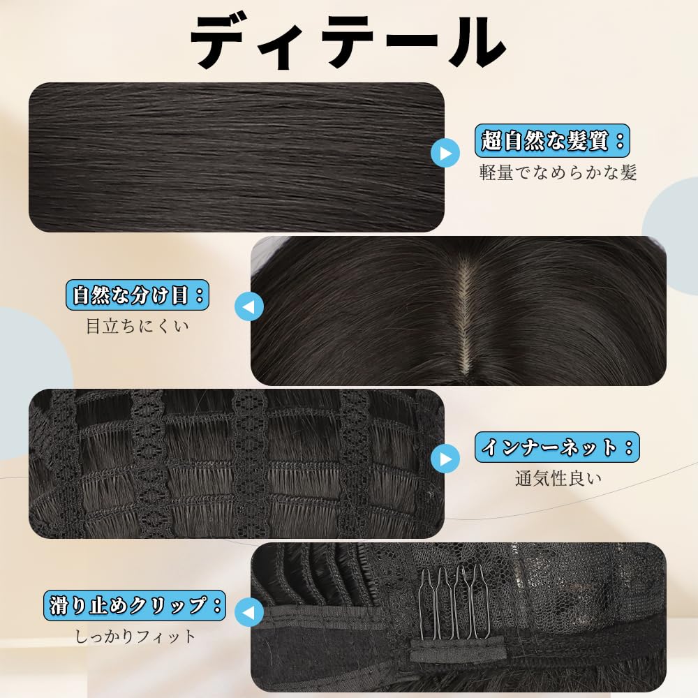 【本物のような自然な仕上がり】 「リアルな質感」:光沢の少ない「ファイバー」を採用し、ちょっとした光の反射も自然に見え、ウィッグ特有のテカリがなく、人毛に近いしっとりとした自然な手触りを作成しました。 「自由なスタイリング」:耐熱160℃(推奨100-120℃)対応で、コテ・アイロン・ドライヤーを使ったアレンジが自由自在。毎日違うスタイルをお楽しみいただけます。 「自然なつむじ」肌色の人工スキンで本物そっくりのつむじを再現。I型デザインで、近くで見ても上から見ても自然な仕上がりです。
