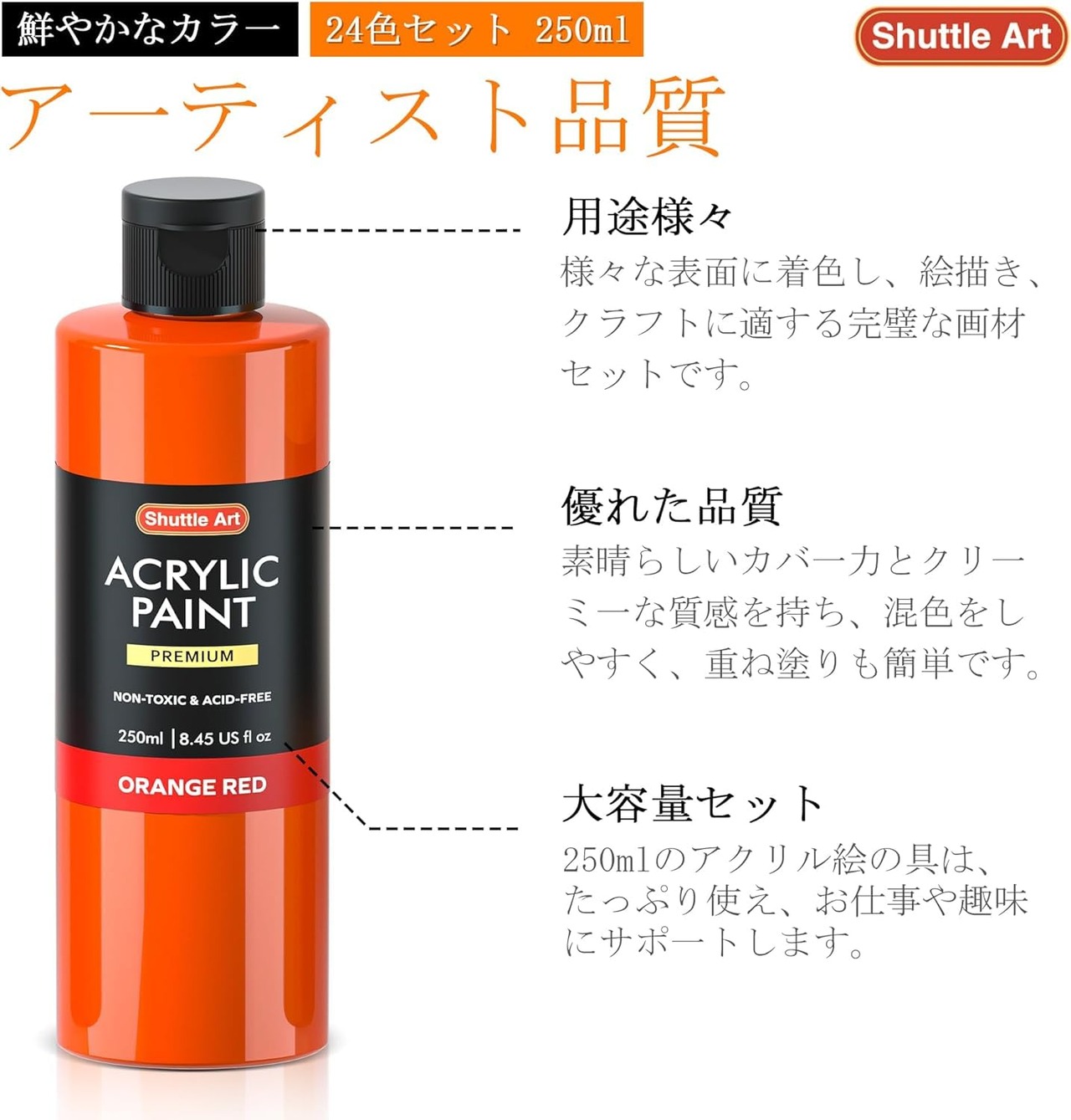Shuttle Art アクリル絵の具 24色 250ml 大容量 絵の具セット 無毒 速乾 耐水 耐久 伸びがいい 鮮やか ボトル キャンバス/石/木材/セラミック/壁に描ける 画材 美術用品 イラスト 大人の塗り絵 アーティスト 美大生 学校用