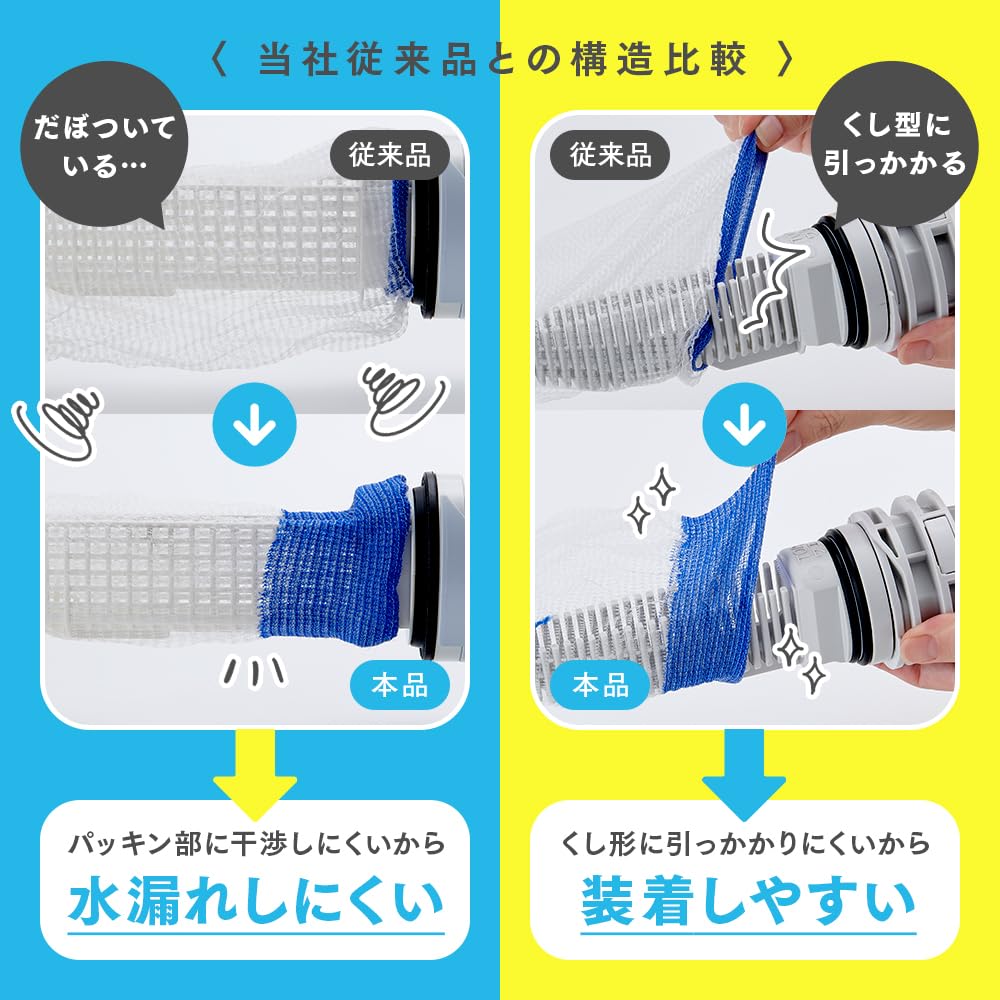 【水漏れを防ぐためには】ゴムパッキンがずれていないか確認してください。ゴムパッキン部にはネットをかぶせないよう注意して装着してください。セットの際に、ネットのたるみがゴムパッキン部に挟まらないようゆっくりと挿入してください。