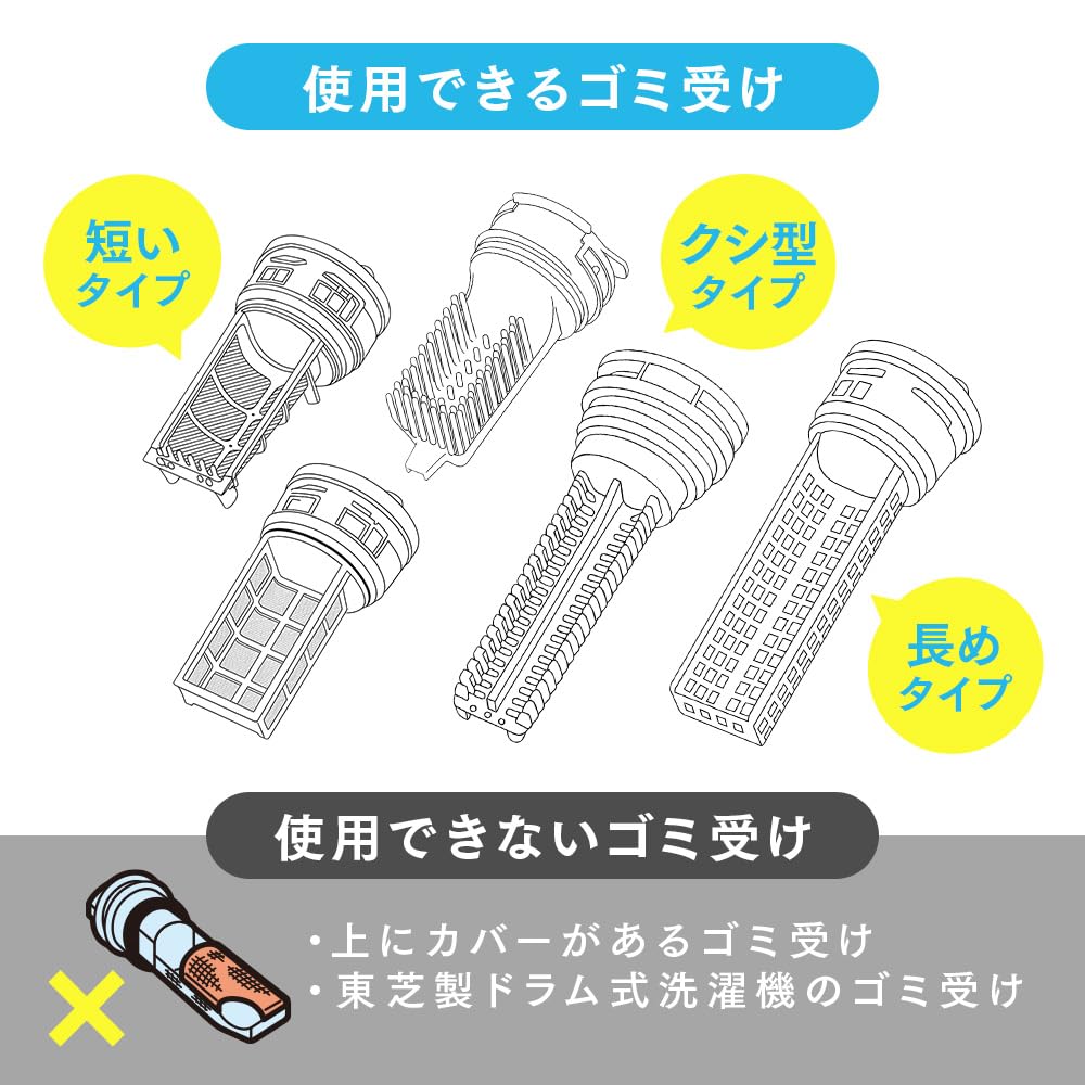 【使用上の注意】・本品はドラム式洗濯機用です。 用途以外には使用しないでください。・ネットが汚れた状態や、ゴミがいっぱいのまま継続して使用しますと、ネットが目詰まりして、水のあふれやゴミ詰まり等のエラーの原因となります。・数日程度での定期的な交換をお勧めします。・洗濯機のゴミ受けの大きさによっては、取り替え頻度が早くなる場合があります。 また、洗濯物の量や衣類の種類によっては、1回の使用でゴミ受けがいっぱいになることがあります。・ワンタッチテープは必ず使用し、「取り外し」はゆっくり行ってください。 ゴミ受けへの固定が不十分な場合、または勢いよく引き出すと、ネットが穴に取り残される恐れがあります。【洗濯の途中にエラー表示が出て、運転停止になったら】・ゴミ受けや排水ホース、排水口などの排水経路に、汚れの付着や詰まりが生じると排水エラー表示やお手入れサインが出て、運転が停止する恐れがあります。・洗濯槽内に水が溜まった状態で洗濯機の扉やゴミ受けを開けないでください。 水が洗濯機外へ流れ出す恐れがありますので、必ず洗濯機の取扱説明書に従い掃除をしてください。・開ける場合は、脱水モードで排水し、念のため洗面器などを用意して水の流出に備えてください。 洗面器などで受けながらゴミ受けのつまみを少し緩め、徐々に水を出してください。