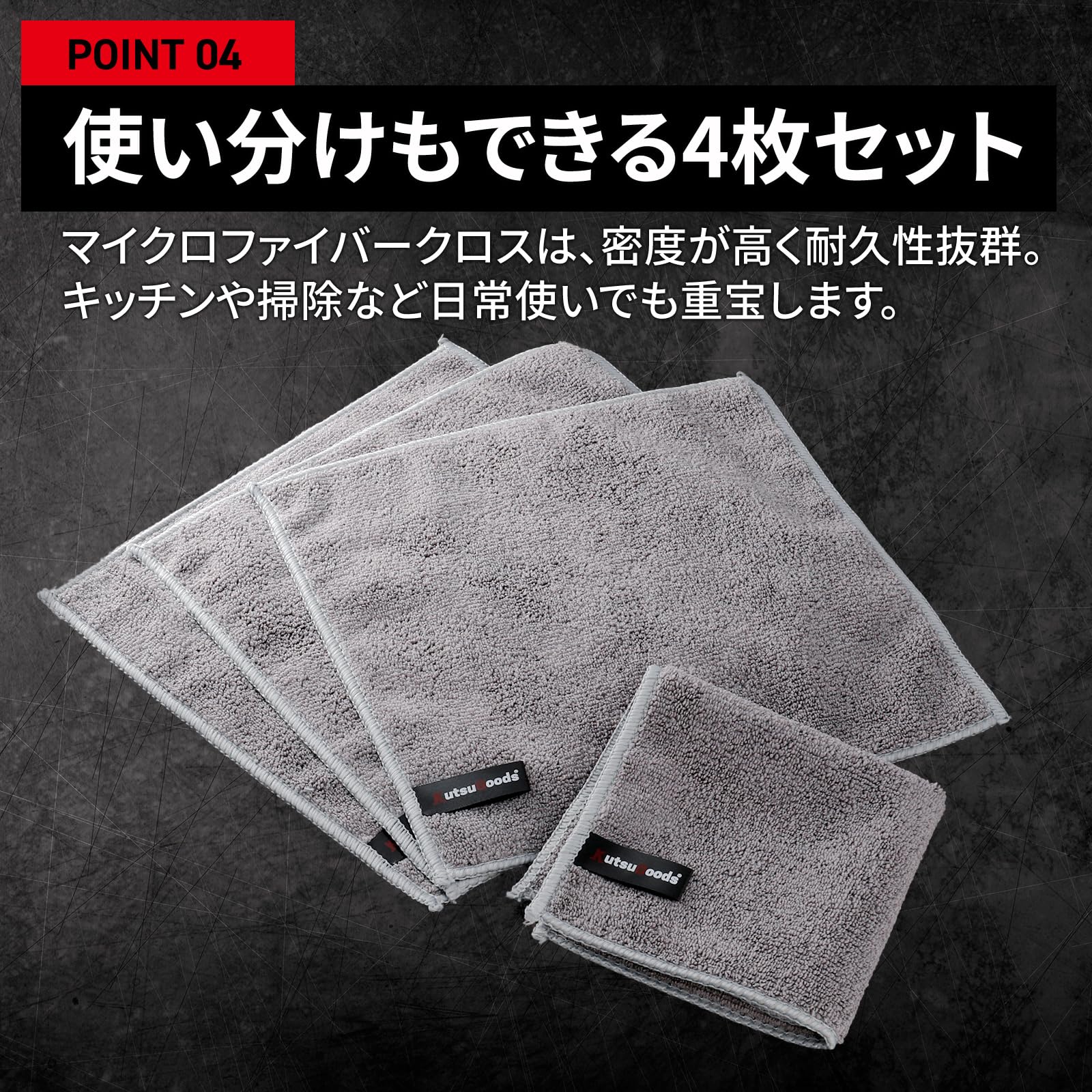 【商品仕様】 【セット内容】:マイクロファイバークロス 4枚 【サイズ】:25cm × 25cm 【素材】:高密度マイクロファイバー 【カラー】:グレー 【お手入れ】:洗濯機で洗えて、乾燥も速い