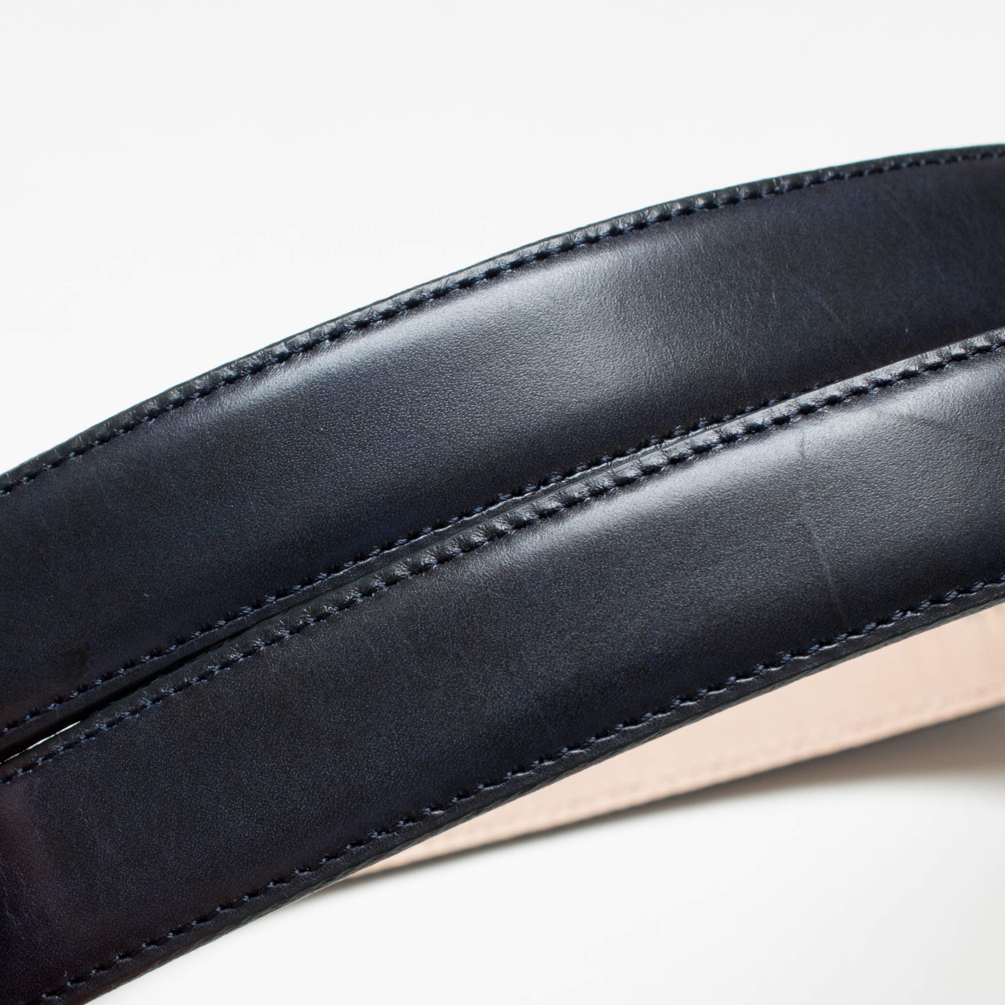 ■表地のルガトーと裏地のヌメ革をステッチで合わせた美しい仕上がり。ベルトの裏面には当店のブランドロゴをシルバーの刻印であしらいました。素材を大切にしながら、日本の職人が一つ一つ丁寧に手作業で作り上げています。