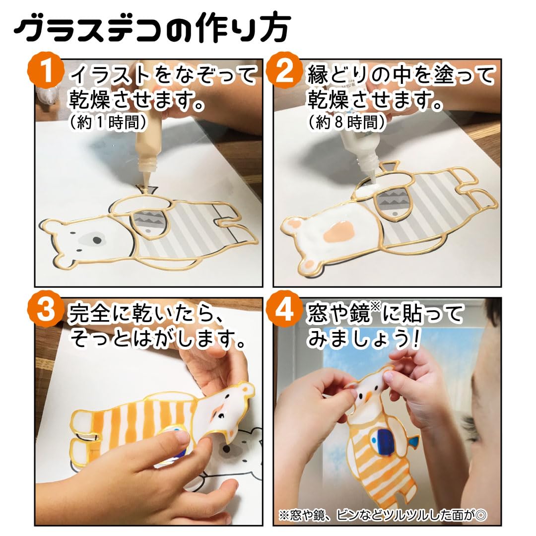 ステンドグラスのような貼ってはがせるシールが作れるクリアカラー絵の具。 のりと絵の具が合体したクリアカラー絵の具。乾くとシールのように窓や鏡などすべすべした面に貼ったりはがしたりできる他、ステンドグラスに似たカラフルな透明感のある色になる。