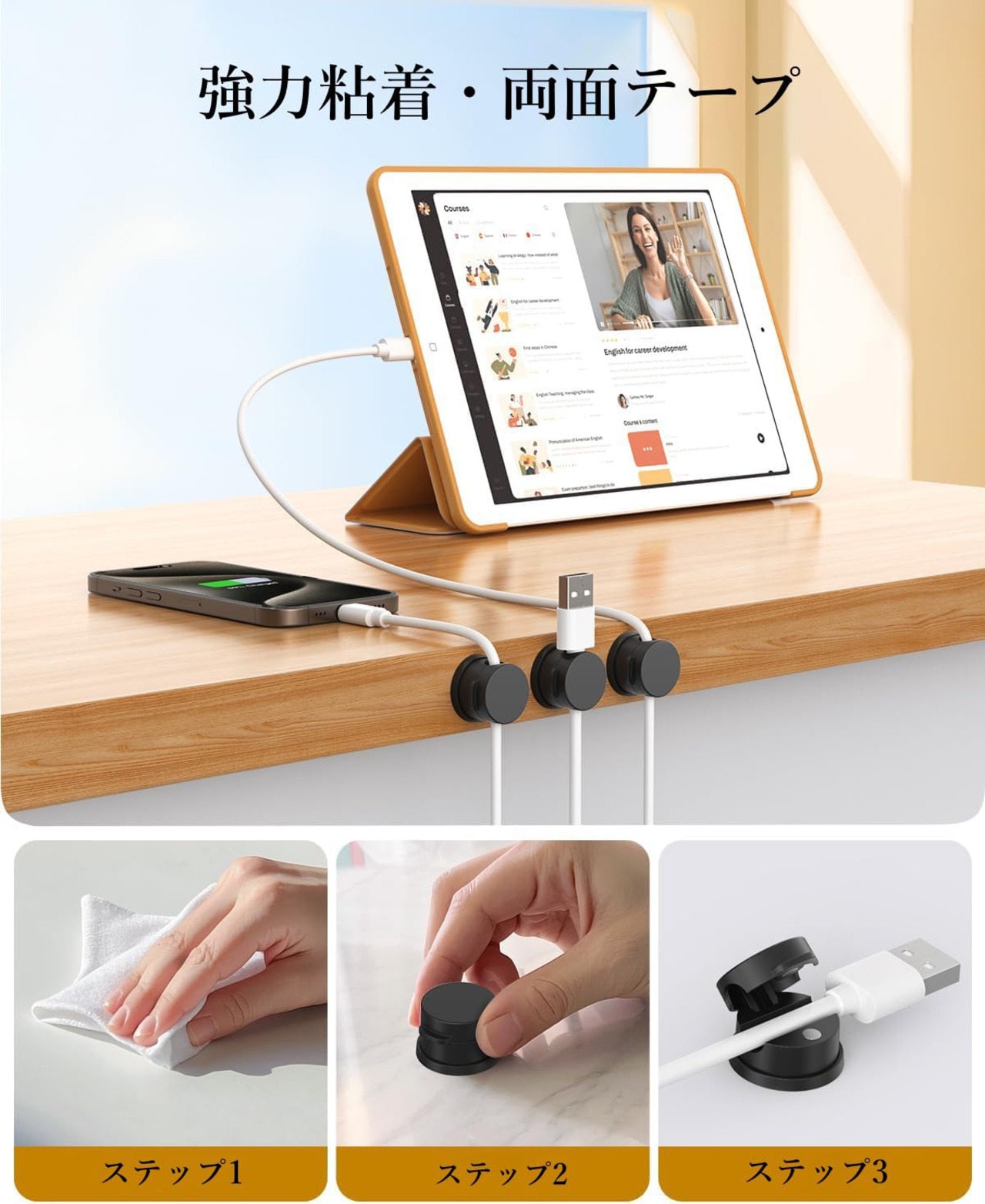 【360°回転可能】2025年最新改善版バネ式ケーブルホルダーを発売しました。粘着テープ留めタイプのをつかってましたが、一旦貼ってしまうとケーブルの角度が固定になって不便だったのですが、本体は特別な360°回転設計を採用し、引っ張ったケーブルの向きを自由に変えられます。貼り付けの向きは気にする必要がありませんので、使用方向を後から変更することの難しさを解決します。