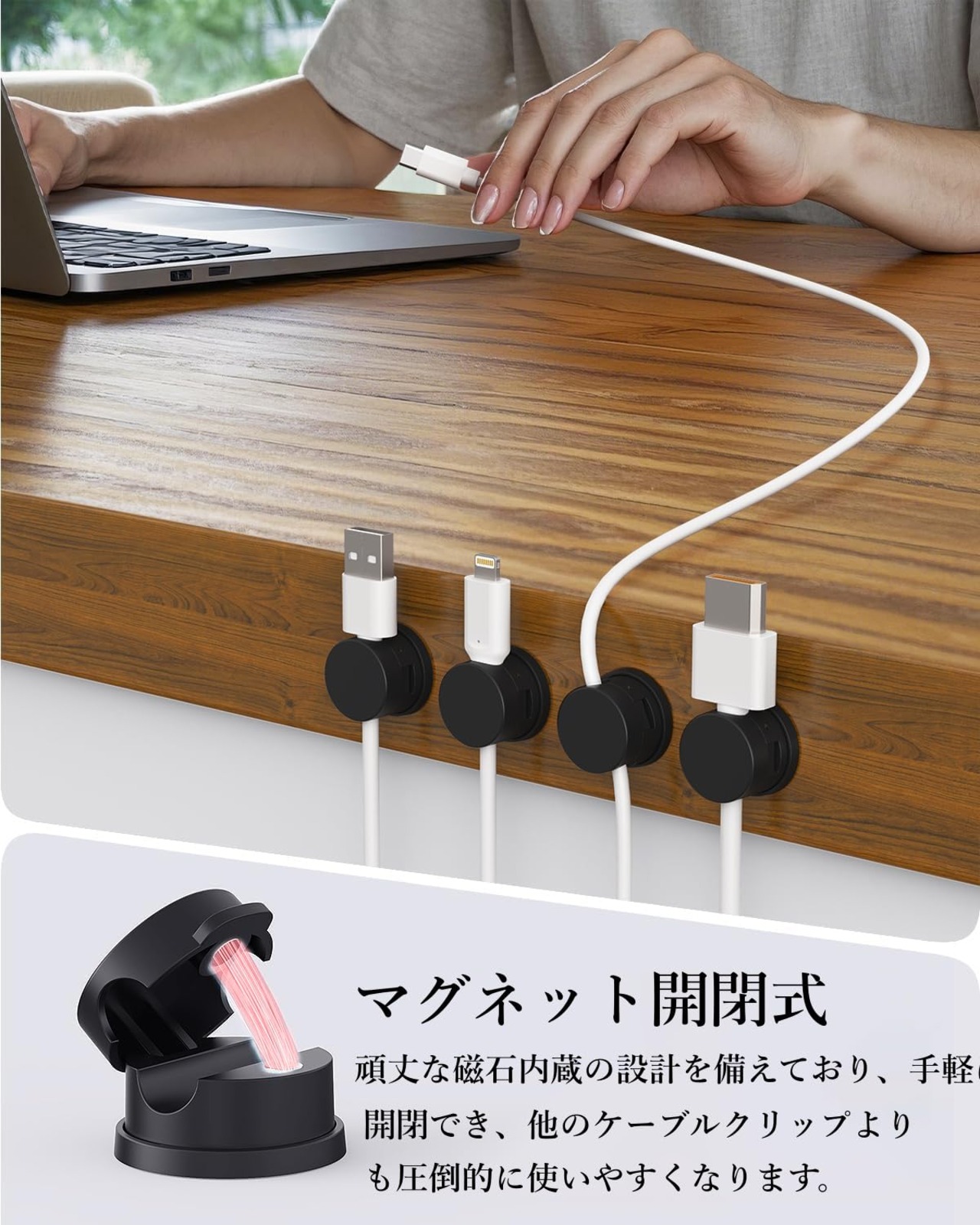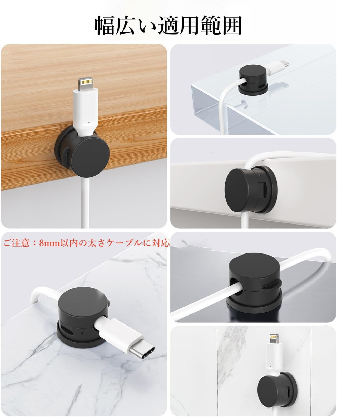 【バネ内蔵・片手操作】頑丈なバネ内蔵の設計を備えており、マグネット式のように磁石が外れるとか、マグネットの力が弱いとかのような心配が一切ありません。手軽に開閉できるタイプで、片手で側からポンとケーブルを固定できます。ケーブルの出し入れが格段に楽になります。暗い所でケーブルを戻そうとするといちいち見て確認しなくても戻せます。ケーブルがスルッと落ちて、何度も拾って困るということも有りません。溝の幅:8mm。充電ケーブル、電源コード、USBケーブル、HDMI配線、 Type-Cコード、lanコード、ACケーブルなど、ほとんどのケーブルに対応可能。